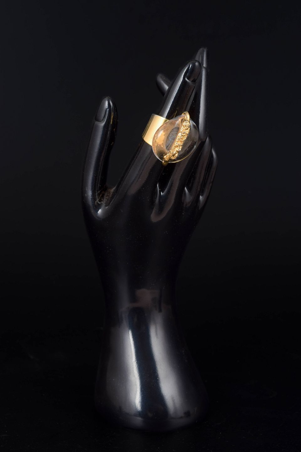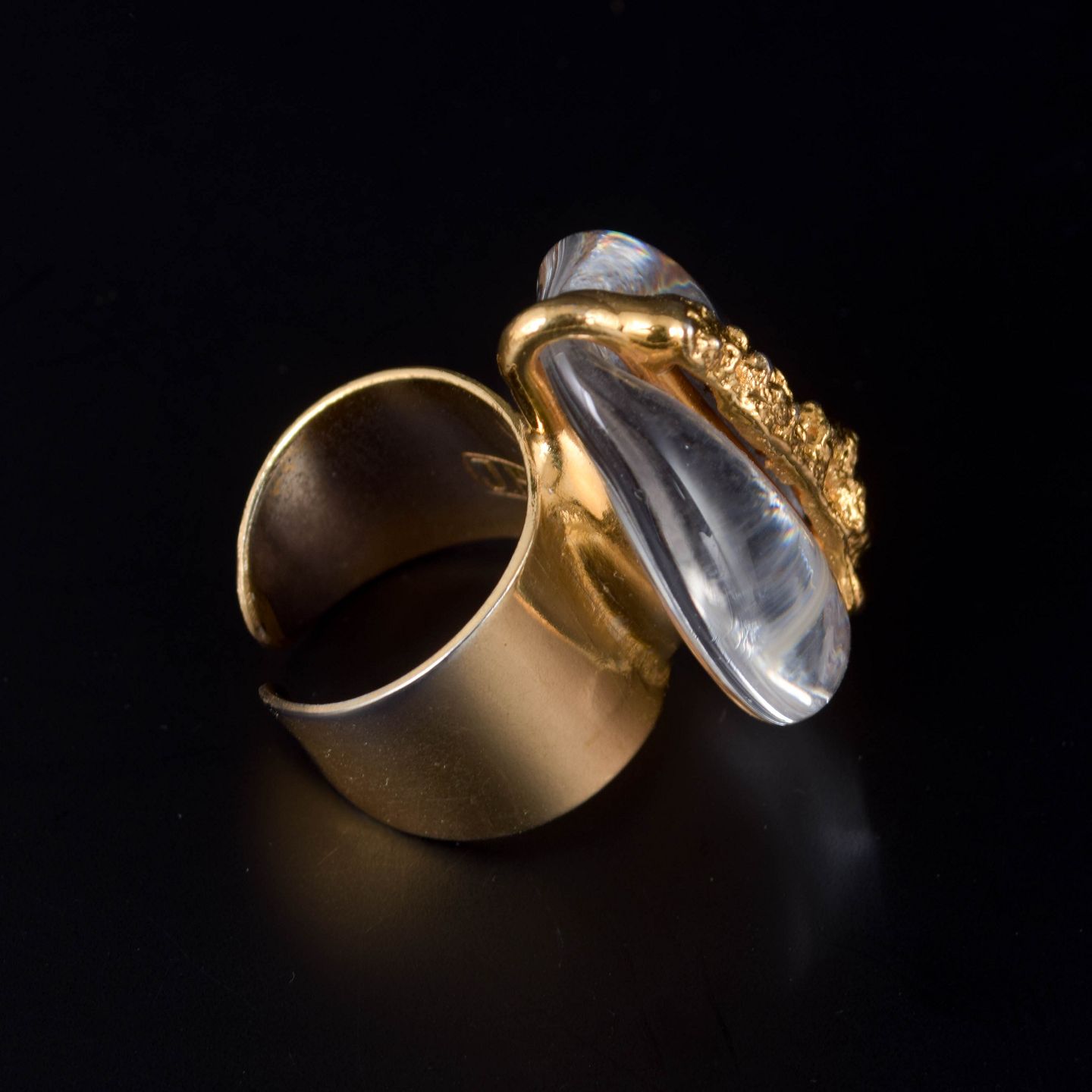 Skulpturelt ringdesign med massiv sølvskinne og en stor organisk formet glassten, indfattet i Hulls karakteristiske dramatiske udtryk. Den transparente sten har et varmt gyldent skær og en markant struktureret kerne, som giver ringen et skulpturelt og smykke-kunstnerisk præg.