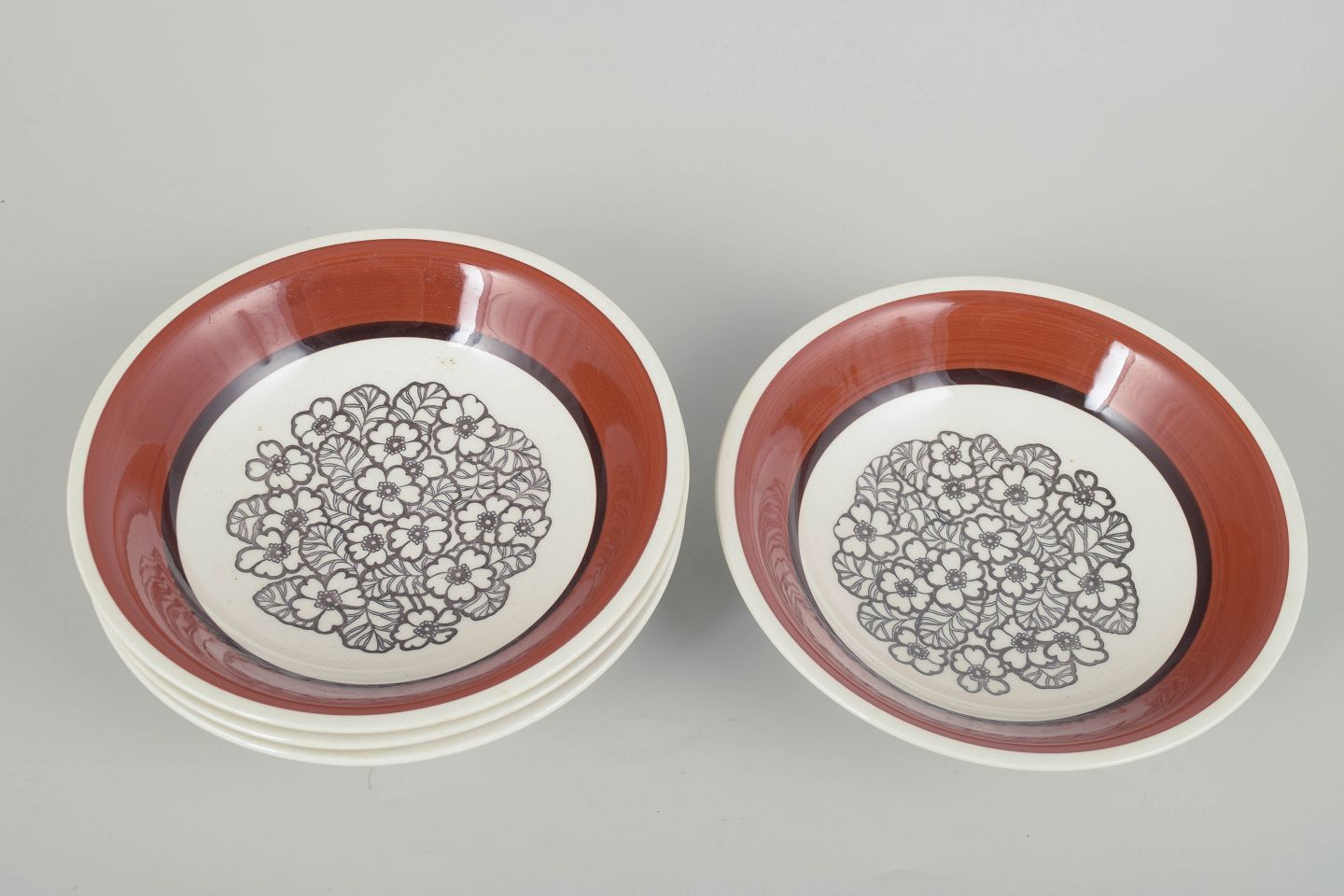 Sæt på 4 dybe stentøjstallerkener med den klassiske Agneta-dekoration: et centralt grafisk blomsterfelt i sorte linjer, omgivet af den varme rødbrune kant, karakteristisk for serien. Ideelle som suppetallerkener eller pastaskåle.