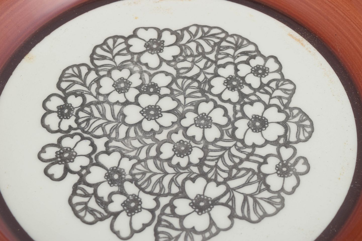 Sæt på 4 store stentøjstallerkener med den karakteristiske Agneta-dekoration: et grafisk blomsterfelt i sorte linjer omgivet af en varm rødbrun kant. Et klassisk 70’er-design fra Gefle med et både dekorativt og funktionelt udtryk.