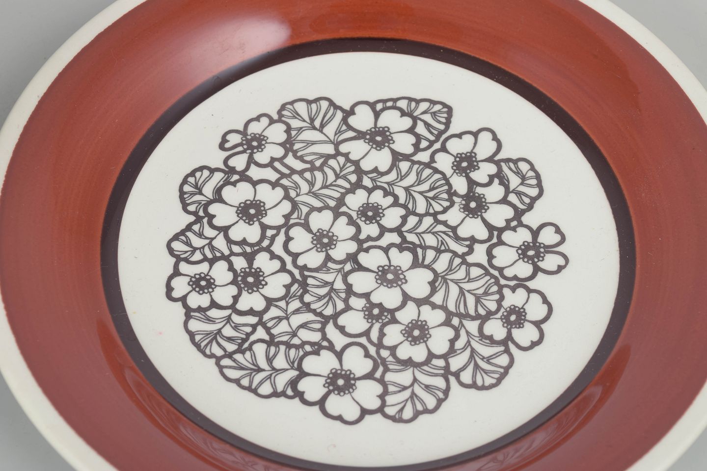 Sæt på ti stentøjstallerkener med den ikoniske blomsterdekoration i brune og sorte nuancer, typisk for Gefles 70’er-design. Enkle, funktionelle former kombineret med grafiske mønstre skaber et tidstypisk og dekorativt udtryk.