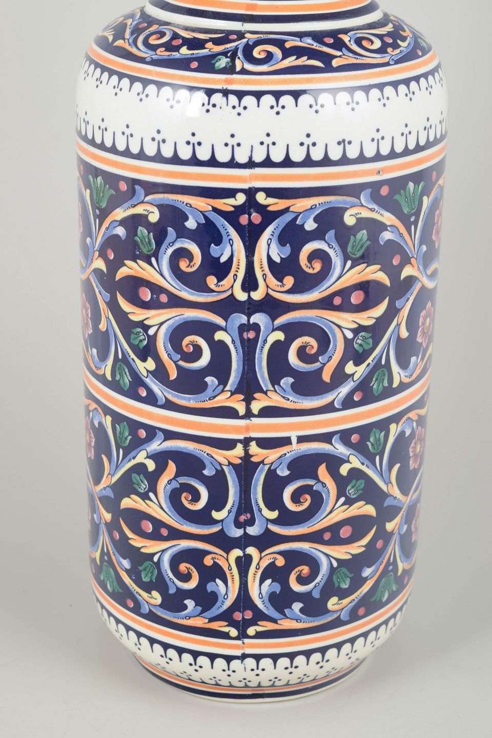 Decorative Italian majolica vase adorned using the decalcomania transfer technique, where the colourful ornamental pattern and portrait medallion are applied as transfer prints in classic majolica style.