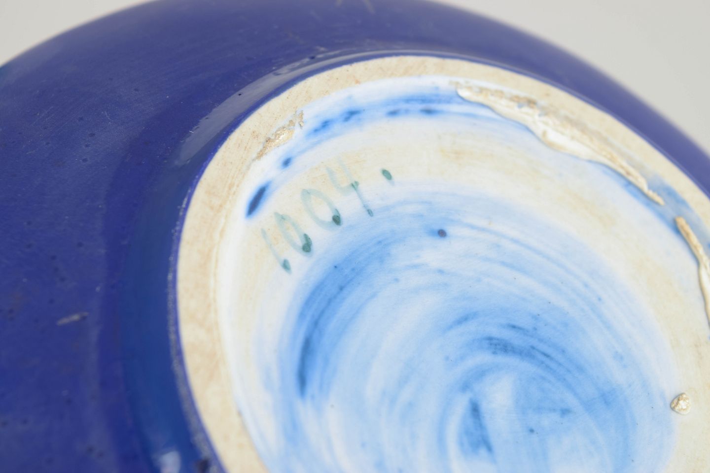 Mat, dybblå stentøjsskål med eksperimentel testglasur, typisk for Kåges arbejde i Gustavsbergs kunstneriske udviklingsfase. Den enkle, afrundede form fremhæver glasurens taktile, næsten pudrede karakter.