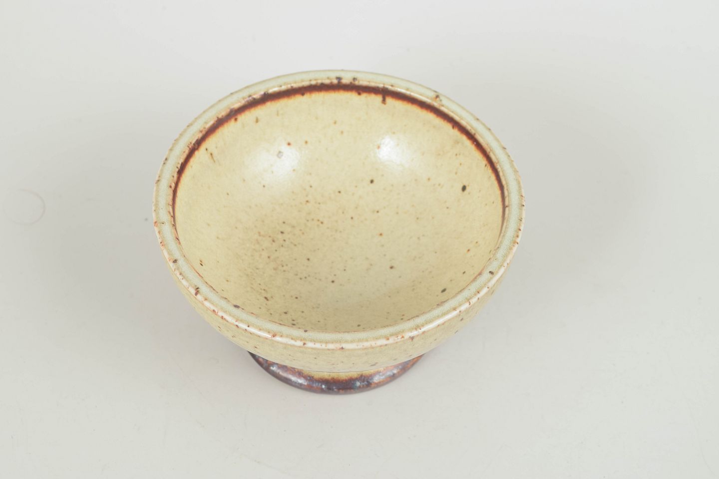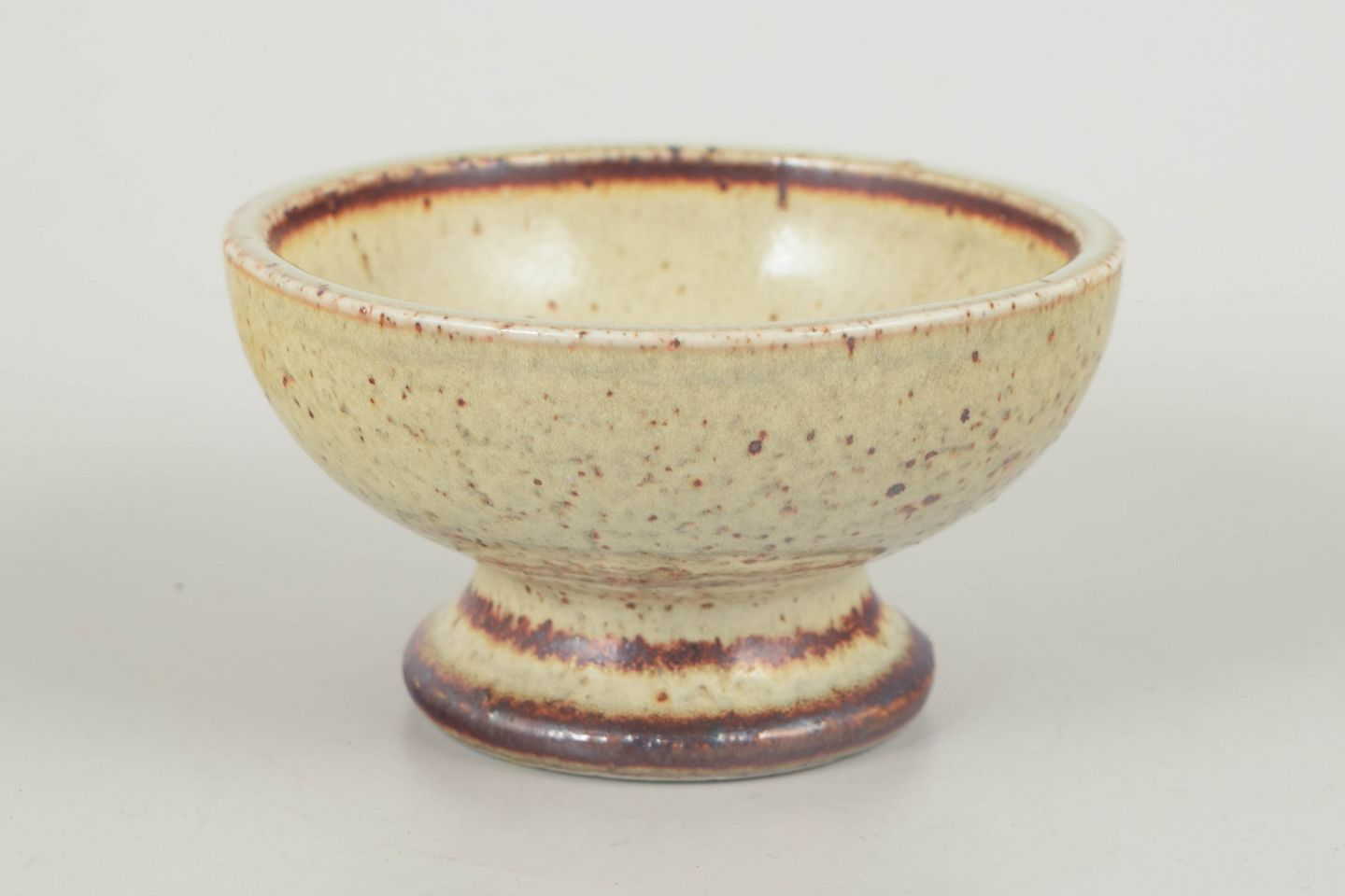 Thrown stoneware bowl on foot with a warm, speckled light glaze and brown accents, characteristic of Drejargruppen’s handcrafted aesthetic of the 1970s.