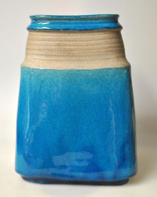 Kähler, Nils Joakim (1906 - 1979): Stor vase. Udført for H. A. Kähler, Næsteved. Turkis glasur. Med kantdekoration. Signeret. H: 23 cm. Dia.: 17 cm.  Perfekt stand!