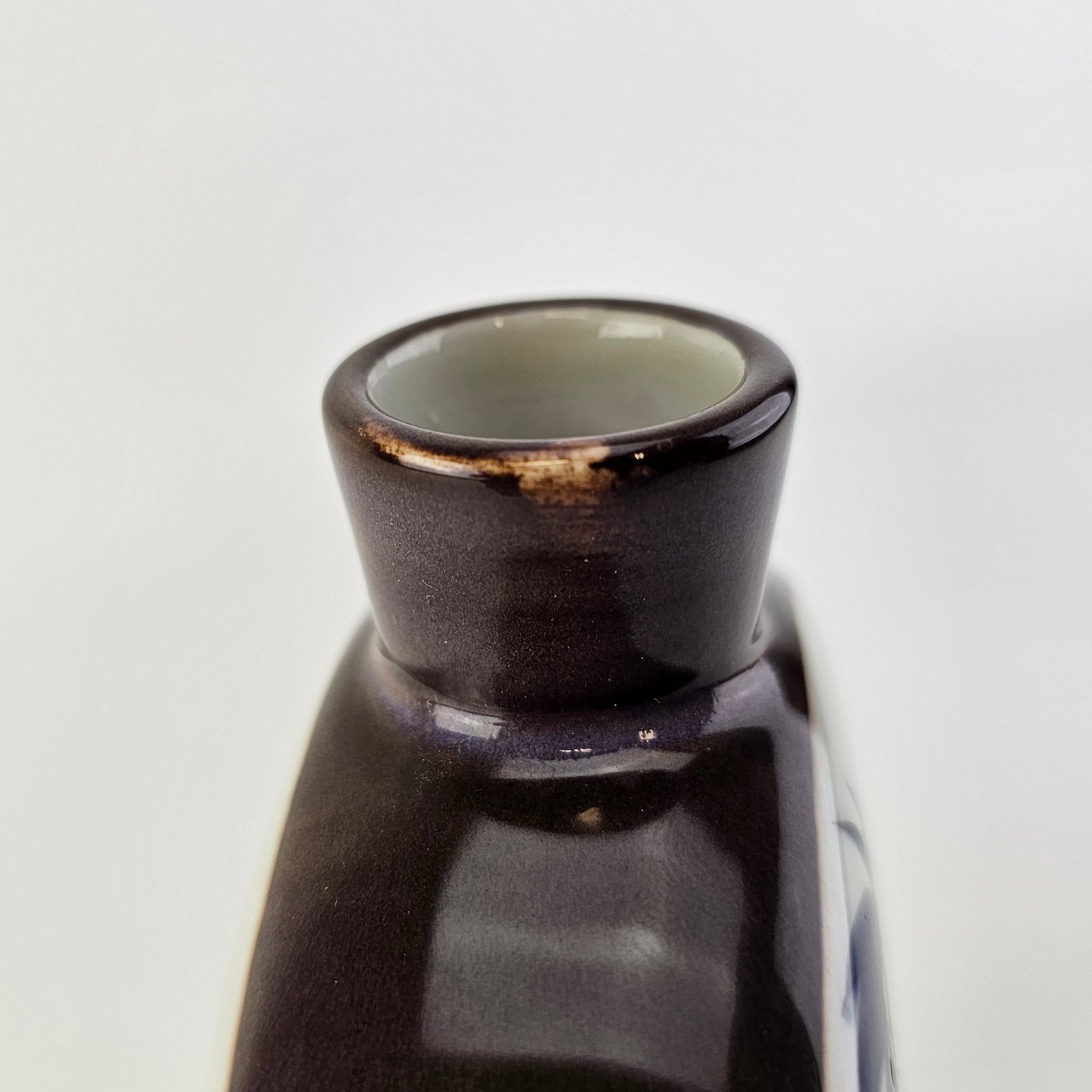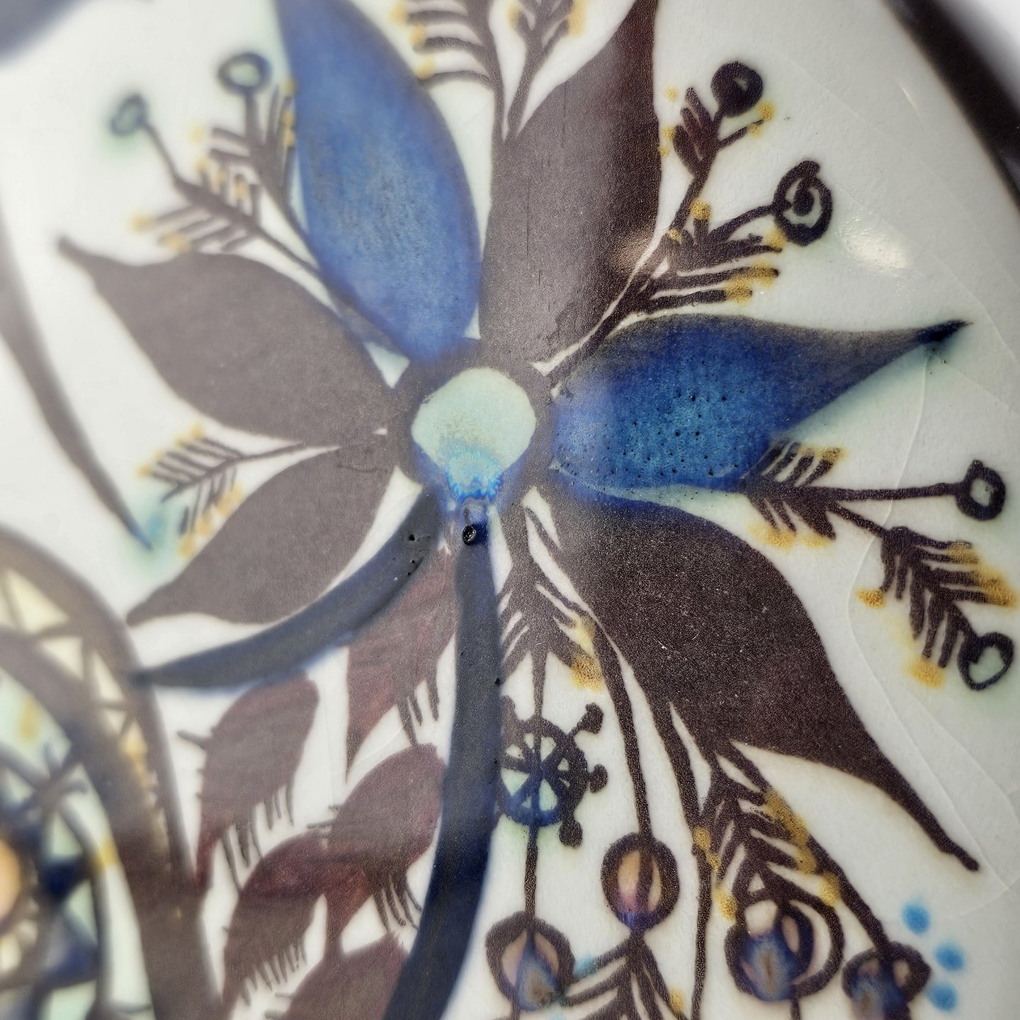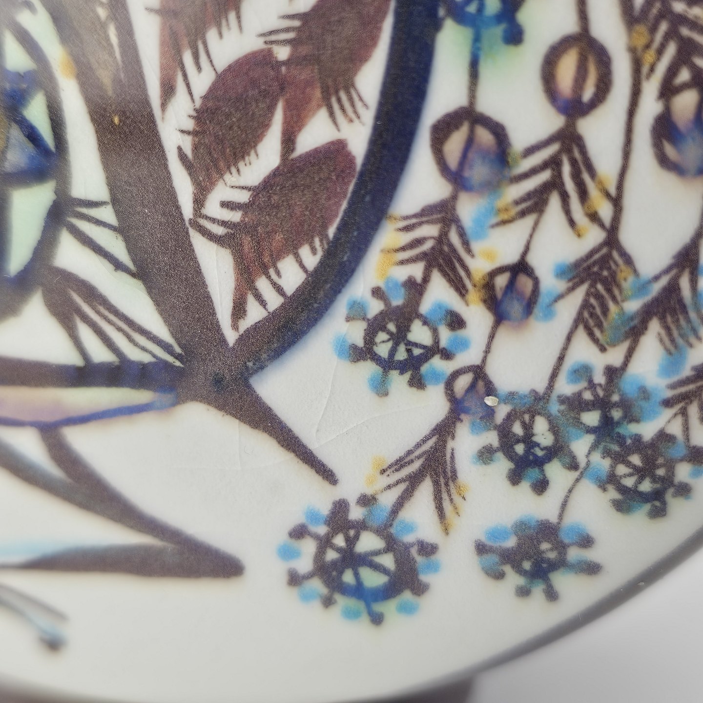 Rund flad vase fra serien Tenera. Vasen er i fajance med motiv af en fugl
