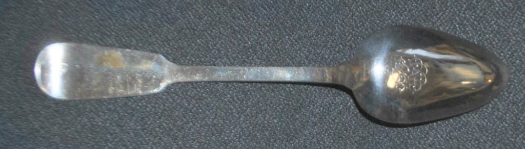 Skipperske  sølv. 1875. Pärnus, Estland. Fra firmaet Jacob Jacke & Co. Givet som gave til skipper J. R. Eriksen. Navn indgraveret. Ske dekoreret med bl.a. anker og sejlskib. Ukendt sølvmester. L.: 21 cm. Med gravering på laf.