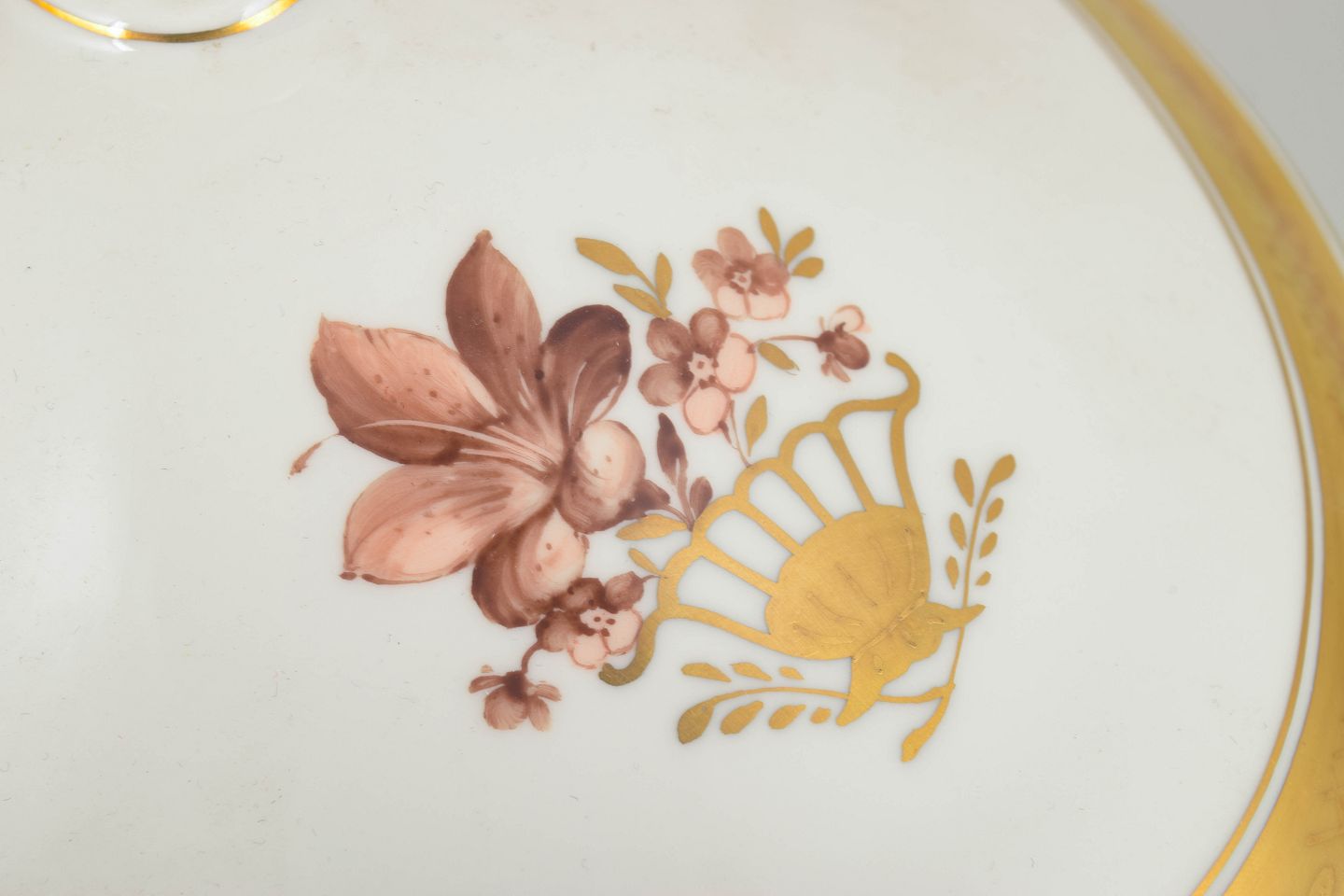 Elegant oval terrin i porcelæn fra Royal Copenhagens klassiske “Guldkurv”-serie, model 595/9348. Udført i 1. sortering med forgyldte detaljer og håndmalede blomsterdekorationer. Med låg.