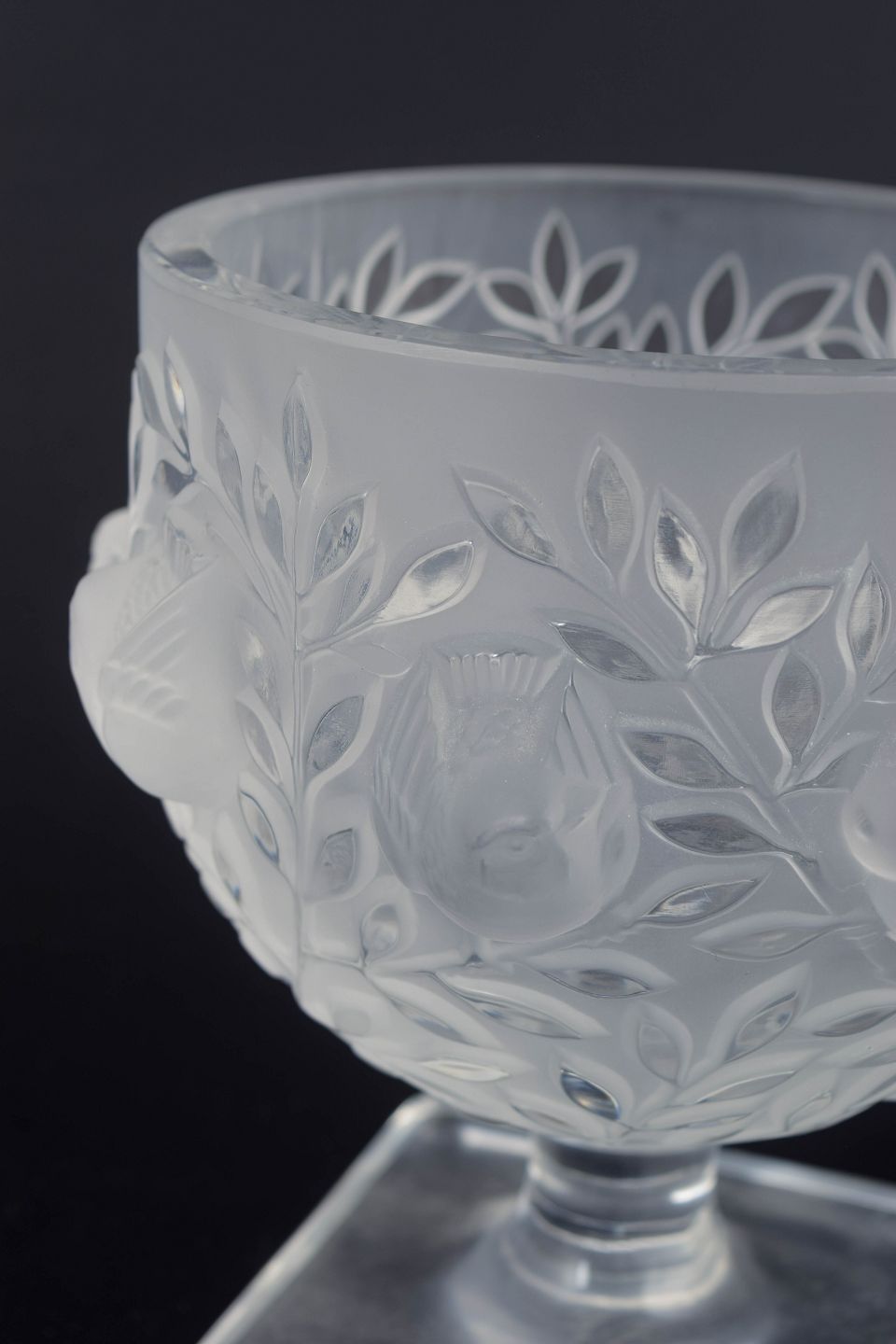 Lalique er verdenskendt for sine frosted krystalværker, hvor naturmotiver – ofte blade, blomster og frugter – udformes i dybe, skulpturelle relieffer. Produktionen fra 1970’erne videreførte René Laliques æstetiske arv med fokus på håndværk, elegance og sans for detaljer.