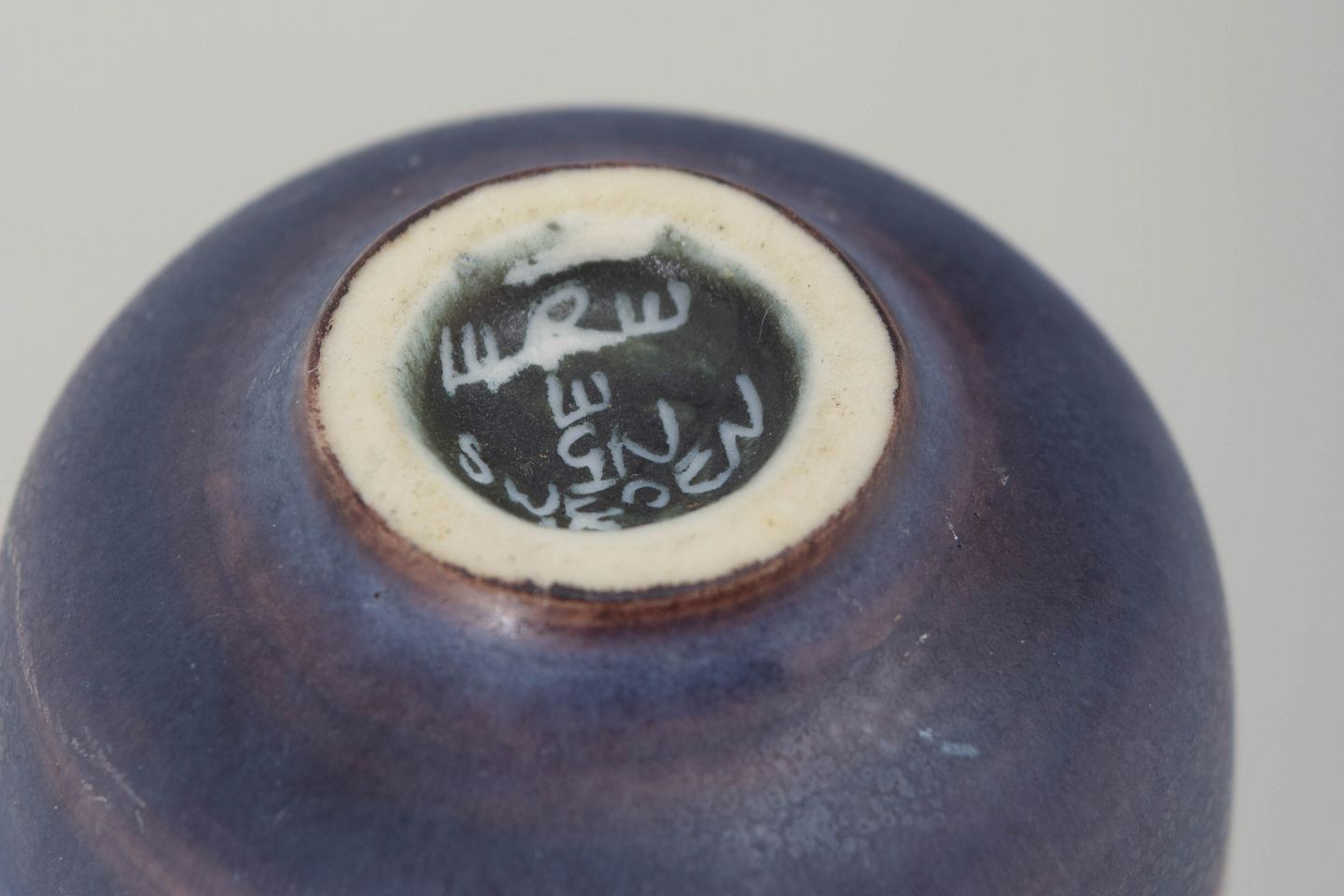 Hånddrejet miniaturevase i stentøj med karakteristiske, bløde stribede dekorationer i violette og cremefarvede nuancer. En elegant lille form med Nylunds velkendte sans for proportioner og taktile overflader.
