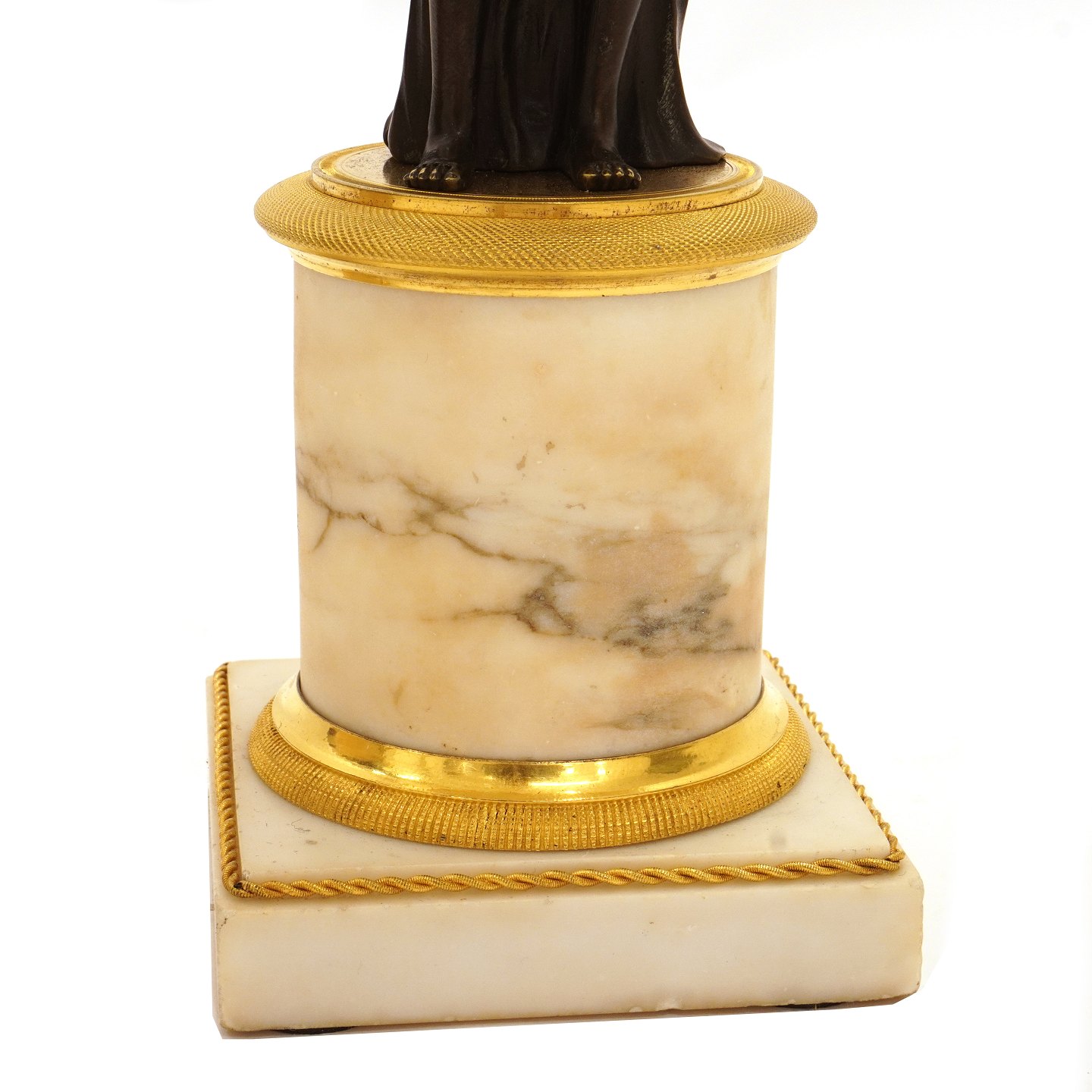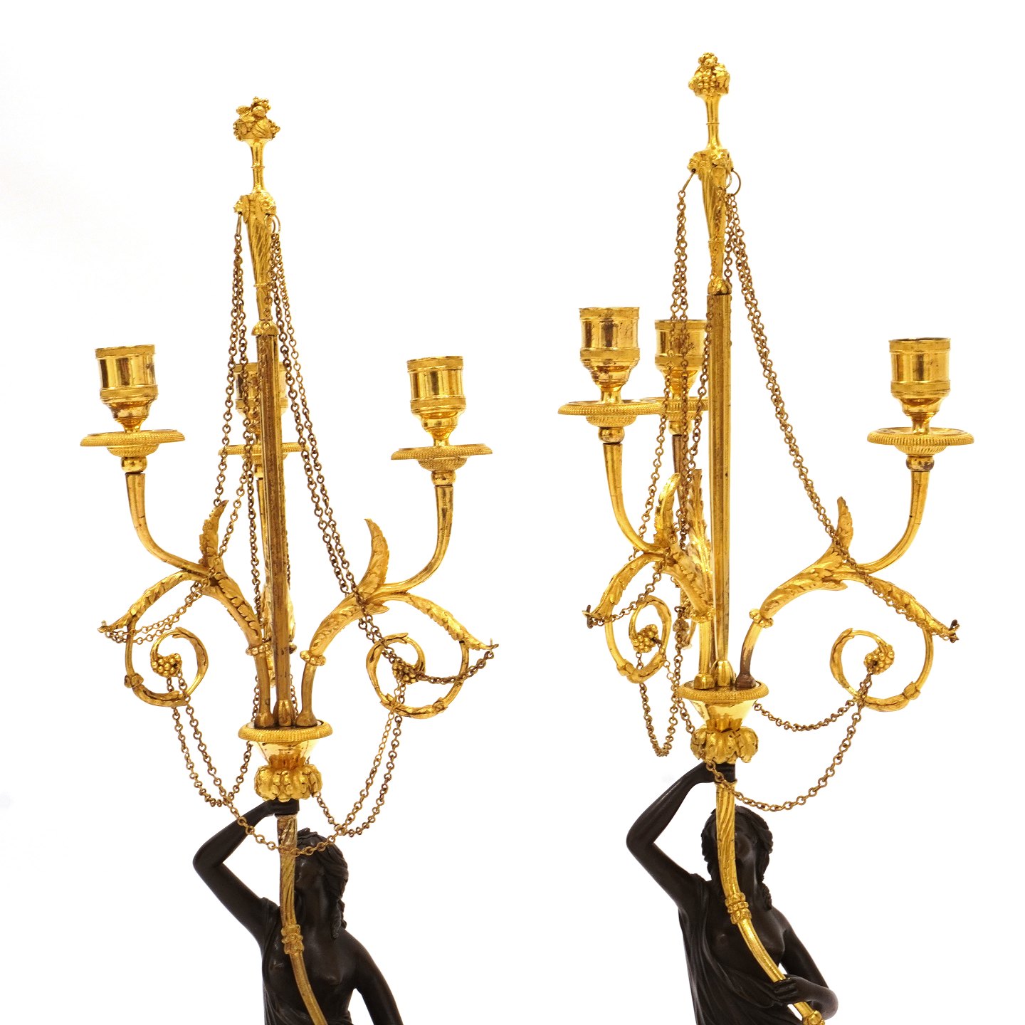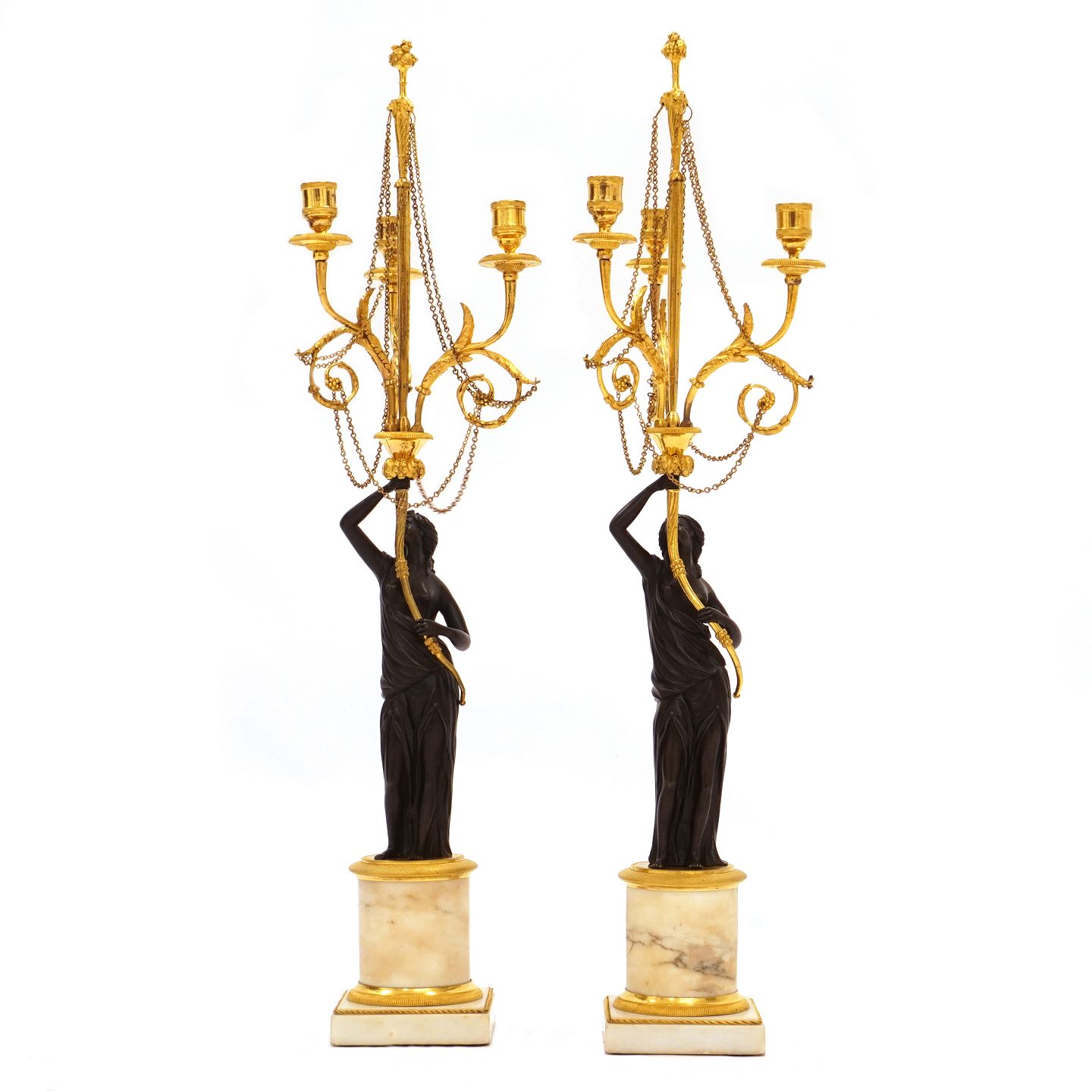 Et par store lueforgyldte og delvist sortpatinerede bronzekandelabre med marmorfod og -stamme