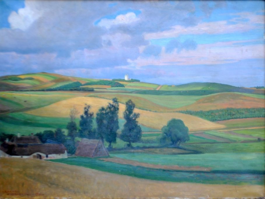 Christiansen, Rasmus (1863 - 1940) Danmark: Landskab ved Hjarbæk, 1916. Olie på lærred. Signeret: RxCHR - Hjarbæk - juli - 1916. H: 56 cm. B: 106 cm.
