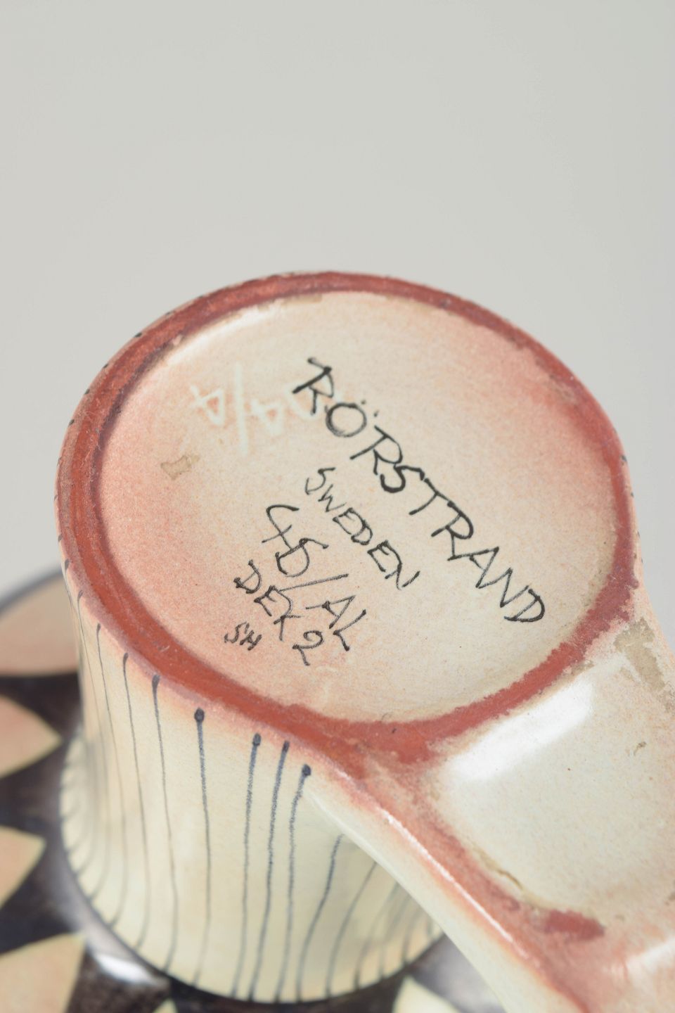 Skulpturelt formet vase i stentøj med markant fod og sidehank. Dekoreret med indridset, lodret linjeføring og kontrasterende sort, grafisk bånddekoration langs kummeranden. Glasuren har en blød, lys tone med tydelig håndværksmæssig karakter, typisk for Stålhane’s produktion hos Rörstrand i 1960’erne.