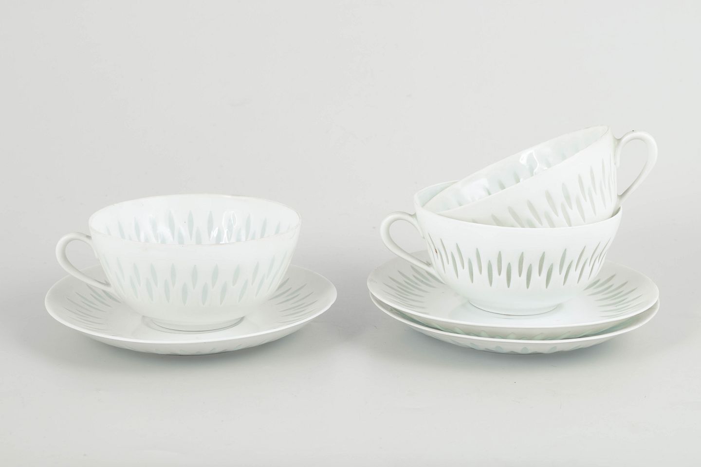 Sæt bestående af tre tekopper med tilhørende underkopper i hvidt porcelæn med gennembrudt “rice porcelain”-dekoration. De aflange perforeringer udfyldt med transparent glasur giver porcelænet et let og næsten translucent udtryk, mens de enkle, afrundede former er karakteristiske for Friedl Holzer-Kjellbergs sene modernistiske porcelænsdesign for Arabia.