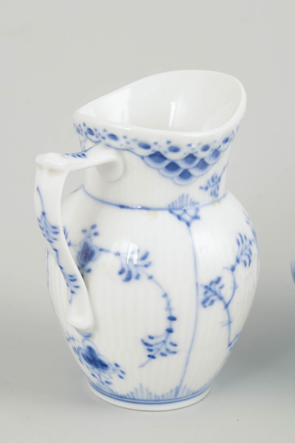 Sæt bestående af flødekande og sukkerskål i musselmalet halvblonde. Begge dele er udført i klassiske riflede former med gennembrudt blondekant og håndmalet koboltblå dekoration. Et harmonisk og elegant sæt til kaffe- og teservering.
