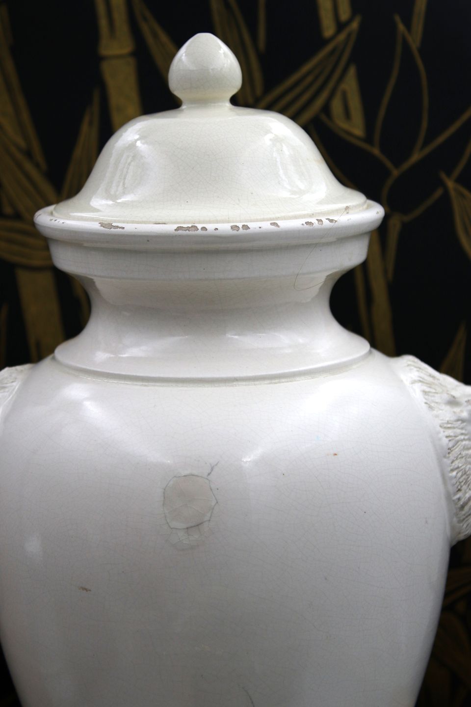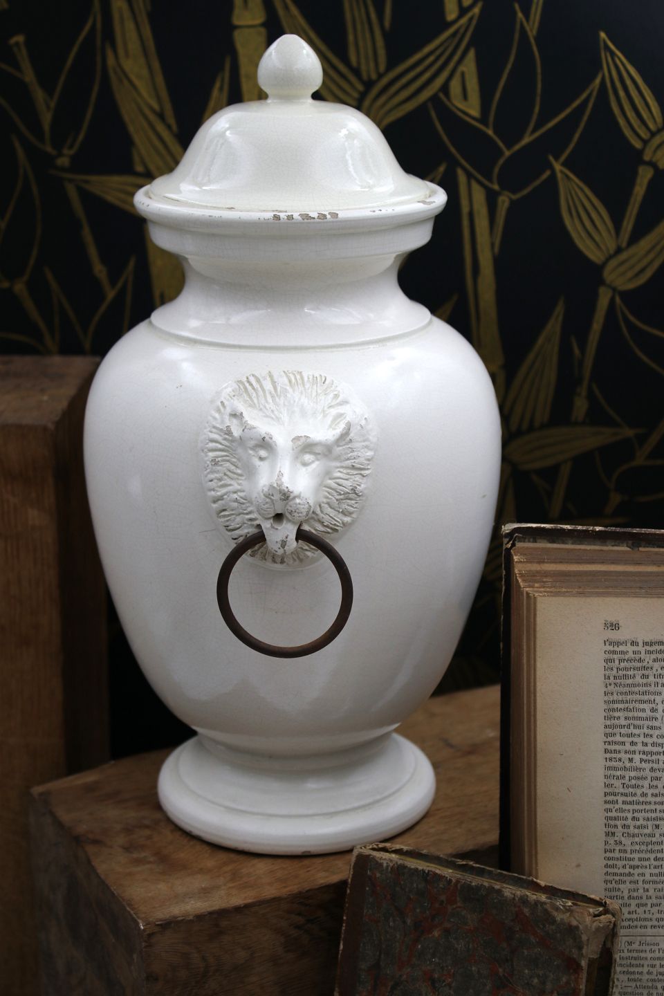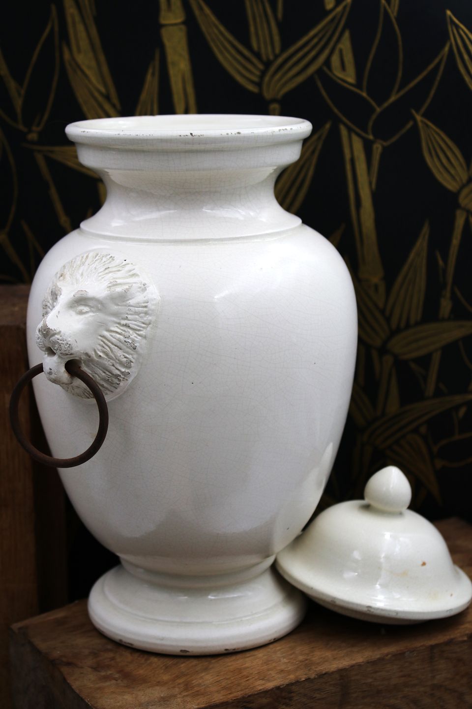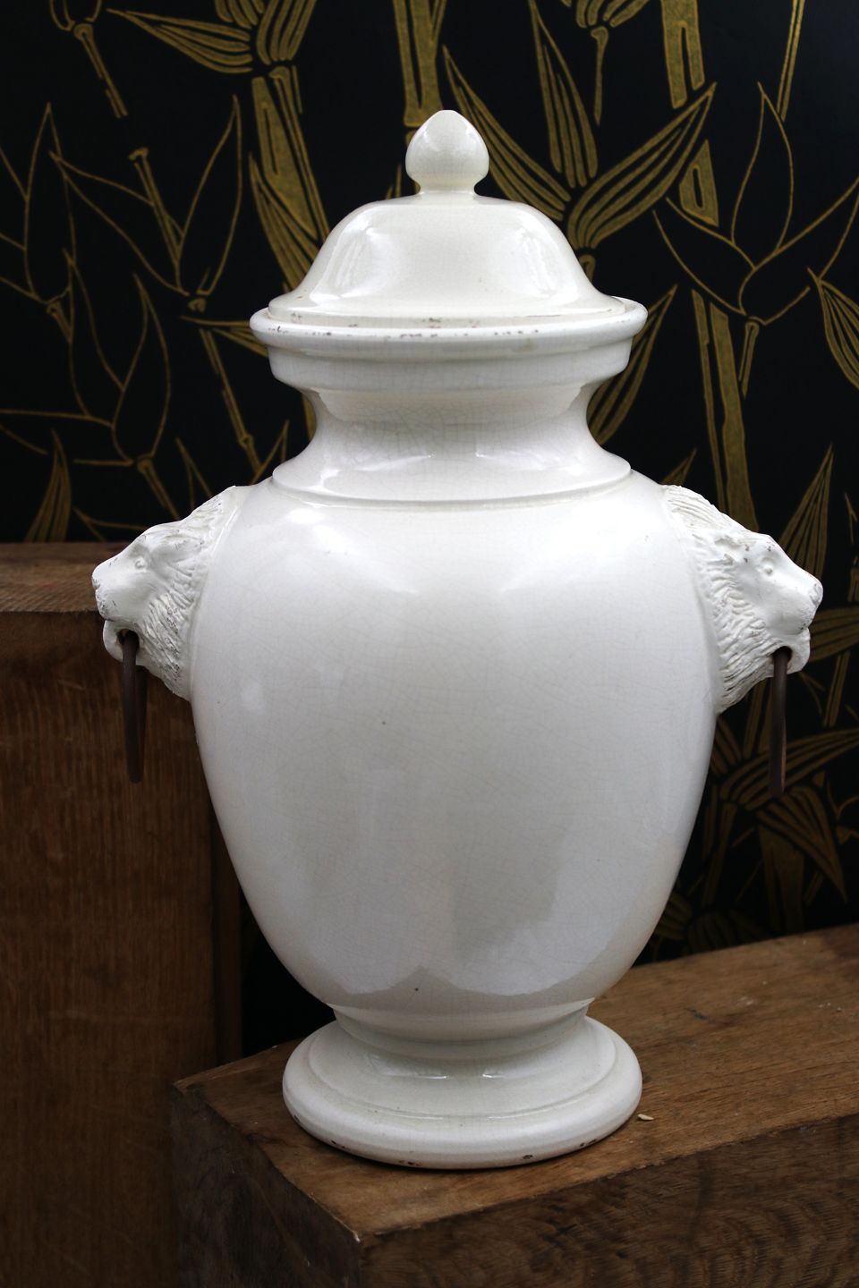 Gammel glaseret stentøjs lågkrukke med løvehoveder på siden.
