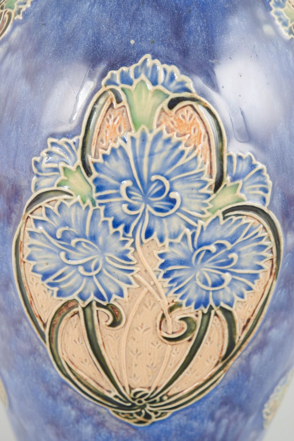 Elegant Art Nouveau-vase udført i glaseret stentøj med dyb blå løbende glasur og reliefdekorerede blomsterfelter i lyse og varme nuancer. Vasen har en harmonisk balusterform med let udadbøjet munding og fremstår som et klassisk eksempel på Royal Doultons dekorative produktion i mellemkrigstiden.