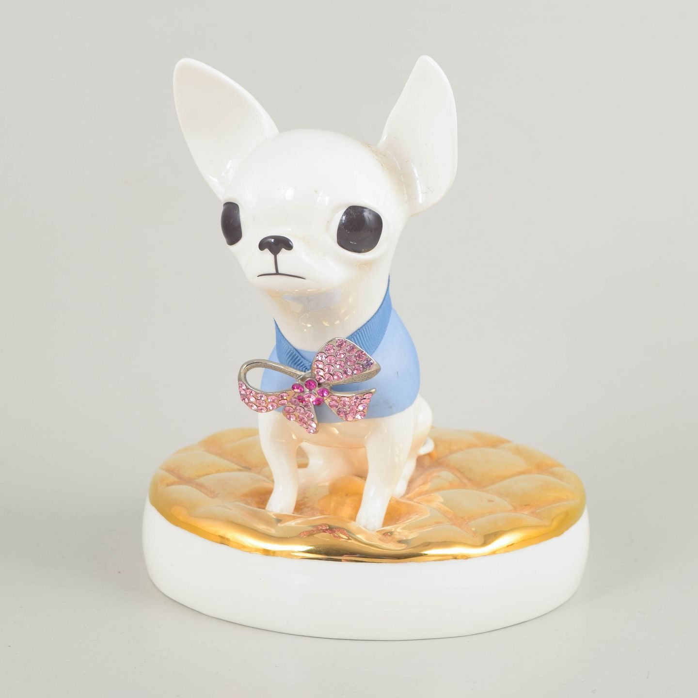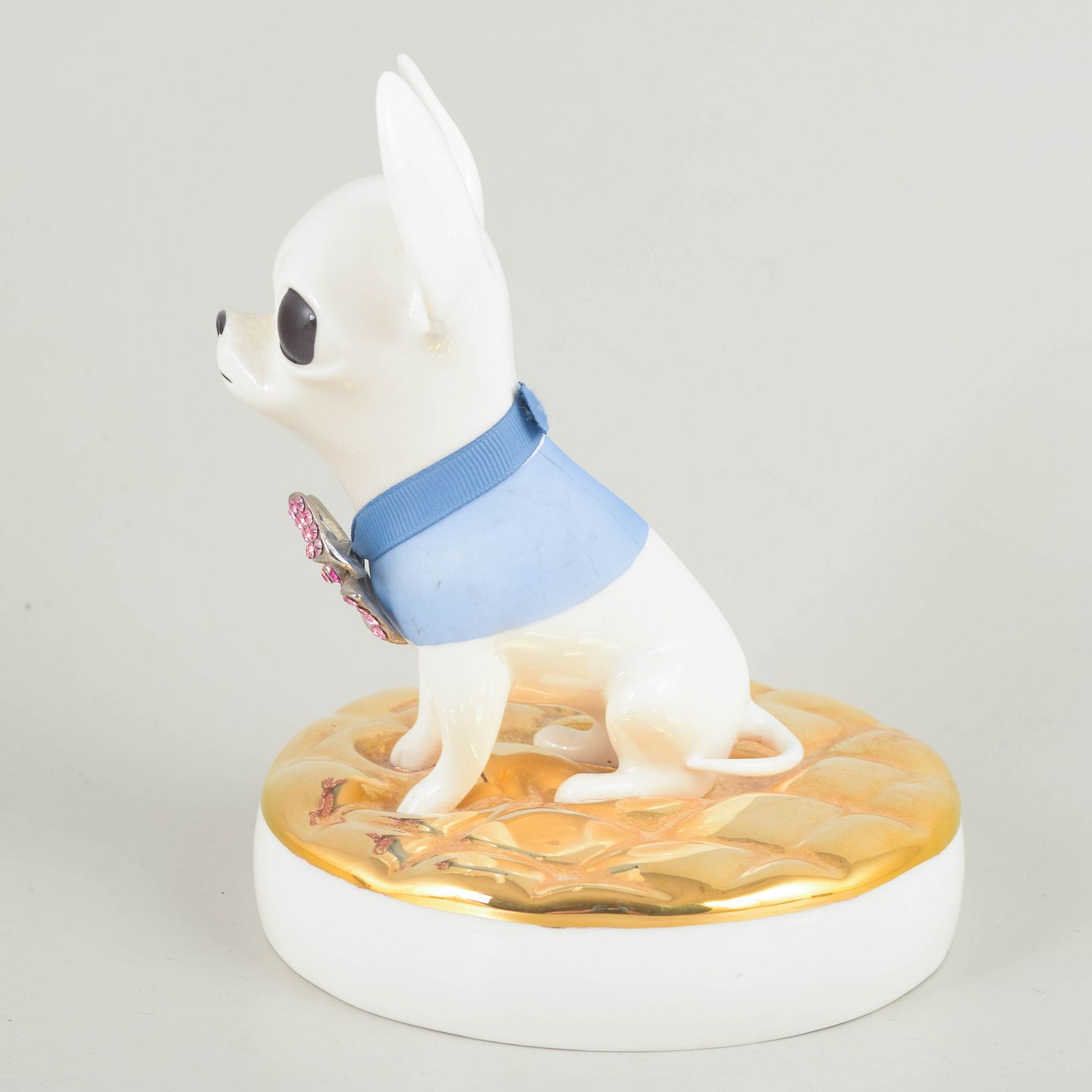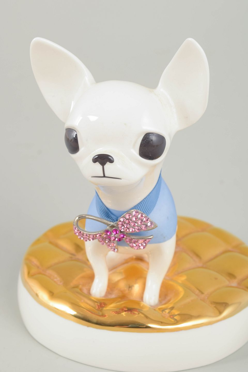 Dekorativ porcelænsfigur forestillende en chihuahua, udført i blankglaseret porcelæn med bemalet dekoration og påsat sløjfe med rhinsten. Figuren står på en polstret pudeformet base med guldfarvet overflade. Produceret af Goebel i en begrænset udgave på 100 eksemplarer.