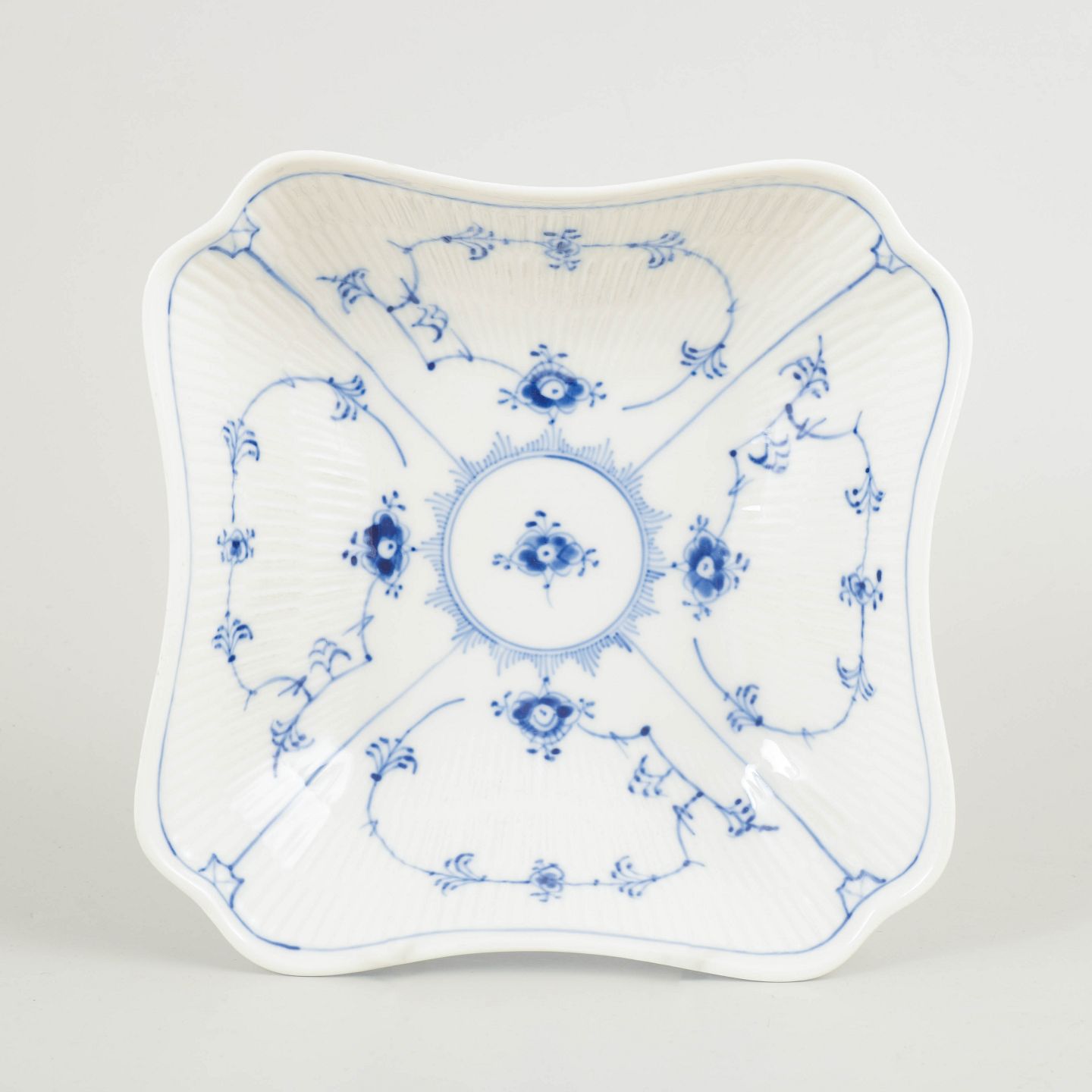 Markant firkantet skål i Musselmalet Riflet, udført i klassisk riflet form med let bølget kant og dekoreret med håndmalet koboltblå underglasur. Skålen er opdelt i fire felter omkring et centralt spejl og fremstår som en karakterfuld og relativt sjældent forekommende serveringsmodel i stellet.