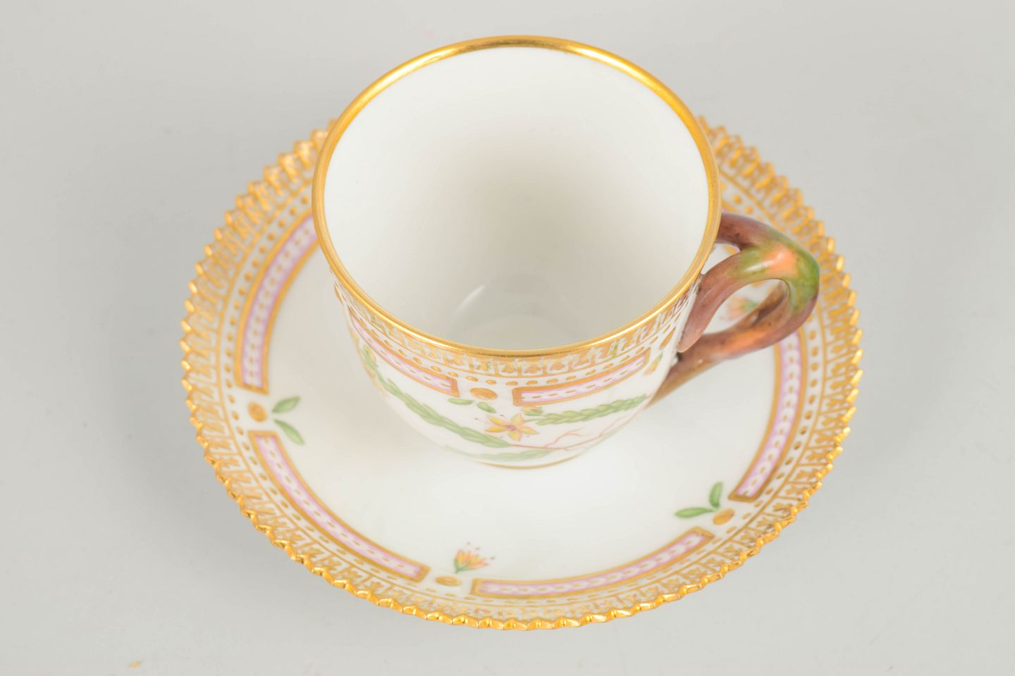 Elegant moccakop med tilhørende underkop i det ikoniske Flora Danica-stel. Koppen er håndmalet med botanisk motiv gengivet efter Flora Danica-værket og udført i stellets karakteristiske, raffinerede formsprog med dekorativ kant. En klassisk og eksklusiv kaffekop.