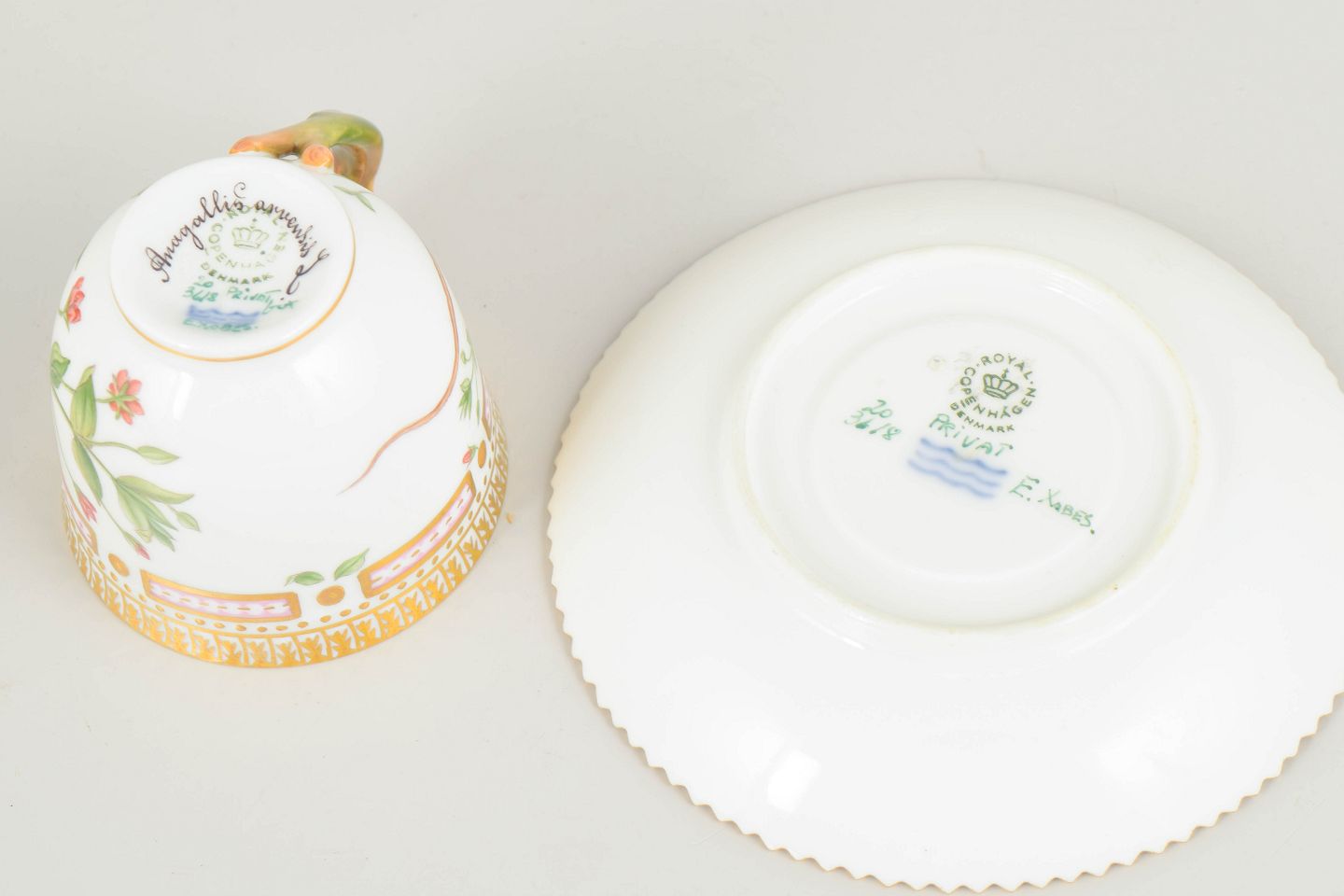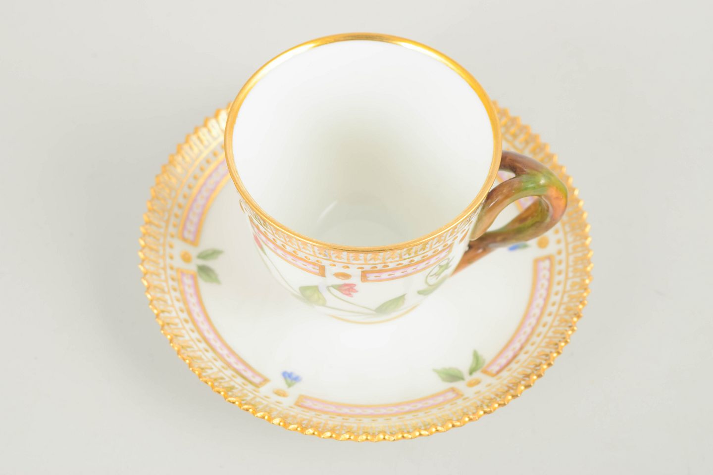 Bio: Flora Danica-stellet blev introduceret i 1790 og regnes blandt Royal Copenhagens mest prestigefyldte produktioner. Dekorationerne er baseret på det monumentale botaniske værk Flora Danica og er kendetegnet ved høj detaljerigdom og fremragende håndværksmæssig kvalitet. Moccakopper var traditionelt anvendt til servering af stærk kaffe og repræsenterer en raffineret del af det klassiske kaffestel.