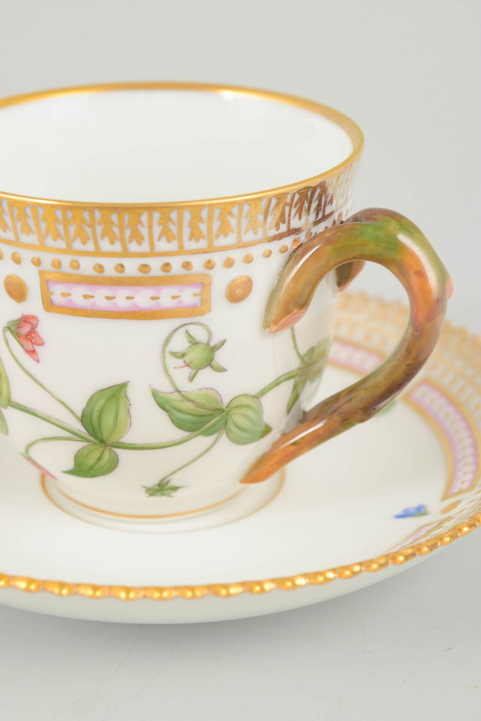 Elegant moccakop med tilhørende underkop i det ikoniske Flora Danica-stel. Koppen er håndmalet med botanisk motiv gengivet efter Flora Danica-værket og udført i stellets karakteristiske, raffinerede formsprog med dekorativ kant. En klassisk og eksklusiv kaffekop.