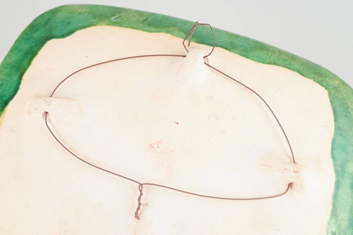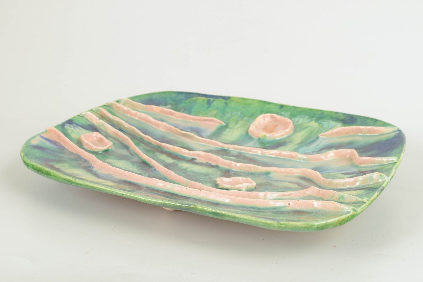 Unikt, væghængt keramisk relief udført i organiske former med markant reliefvirkning. Overfladen er rigt modelleret med bølgende linjer og forhøjede partier, dekoreret med levende glasurer i grønne og blå nuancer, kontrasteret af bløde, lyserøde reliefelementer. Et ekspressivt og sanseligt værk, der tydeligt afspejler 1970’ernes eksperimenterende keramiske udtryk.