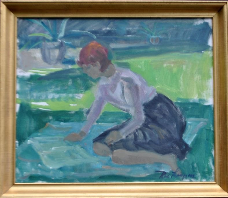 Leepin, Robert (1885 - 1967) Danmark: Pige med bog i have. Olie på lærred. Signeret: Rob. Leepin. H: 46 cm. B: 55 cm.