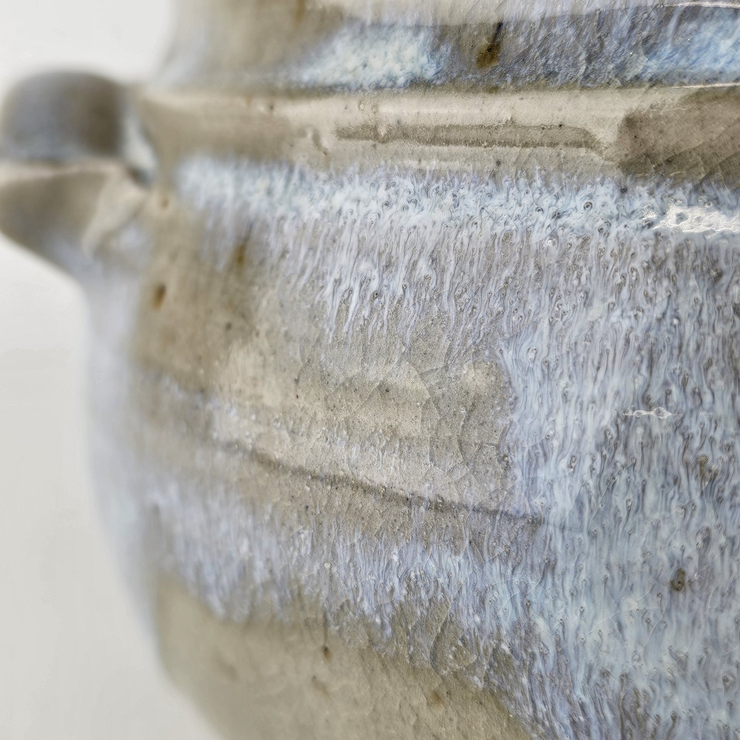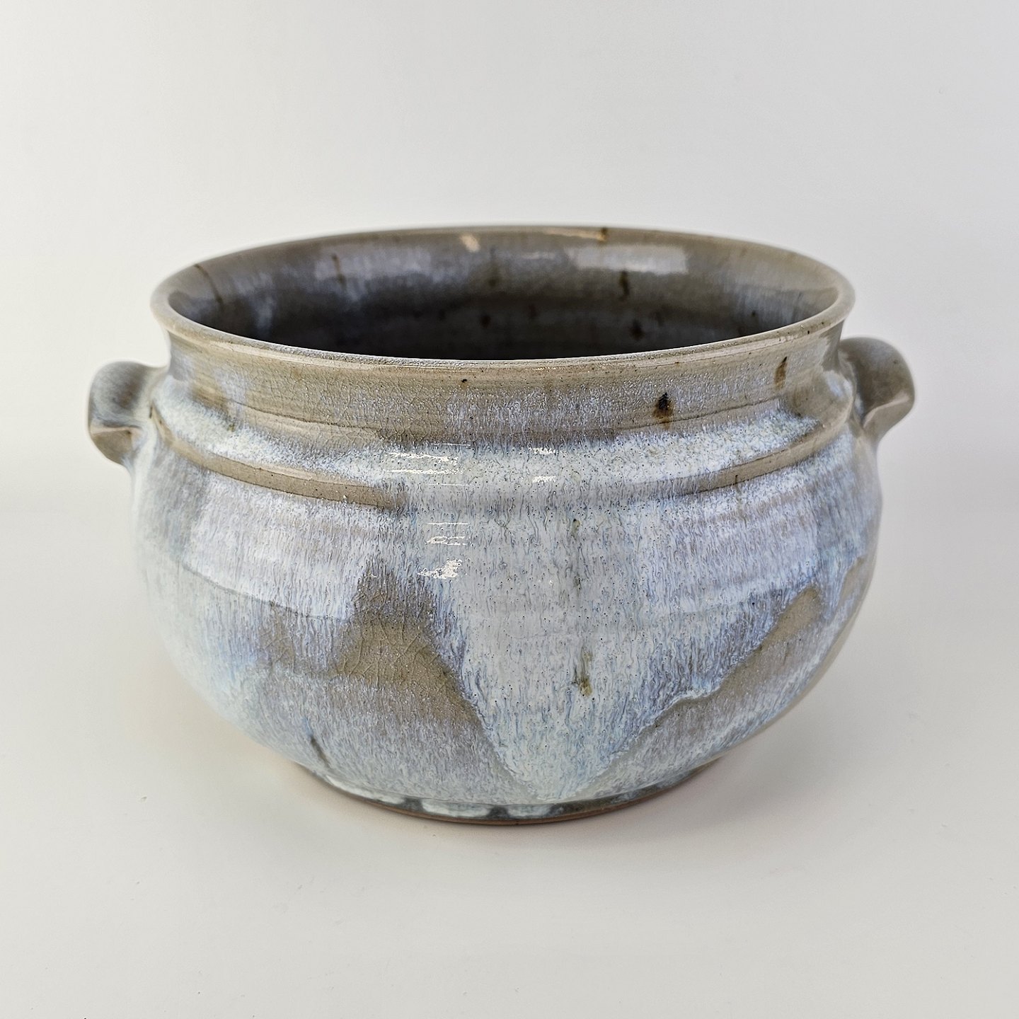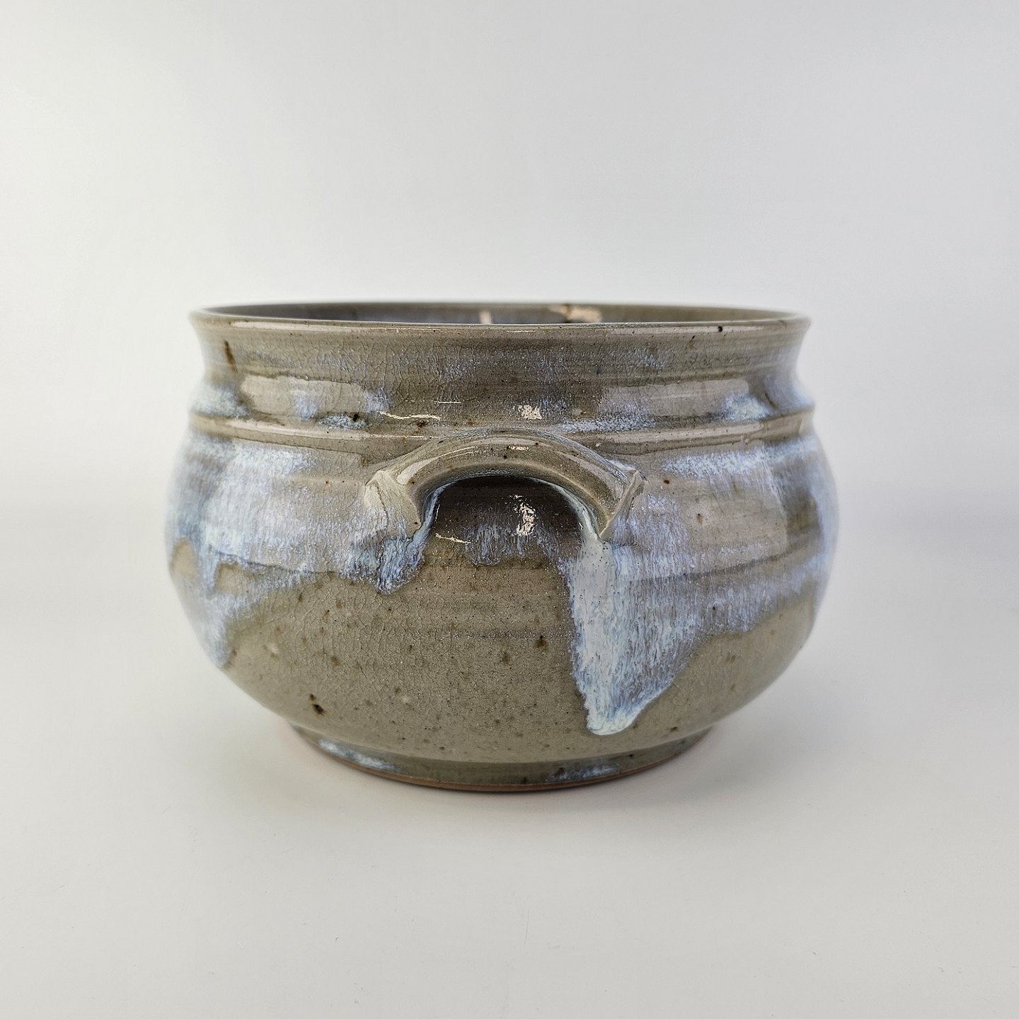 Blålig og grønlig keramik unika skål med 2 hanke med krakkeleringer i glasuren.