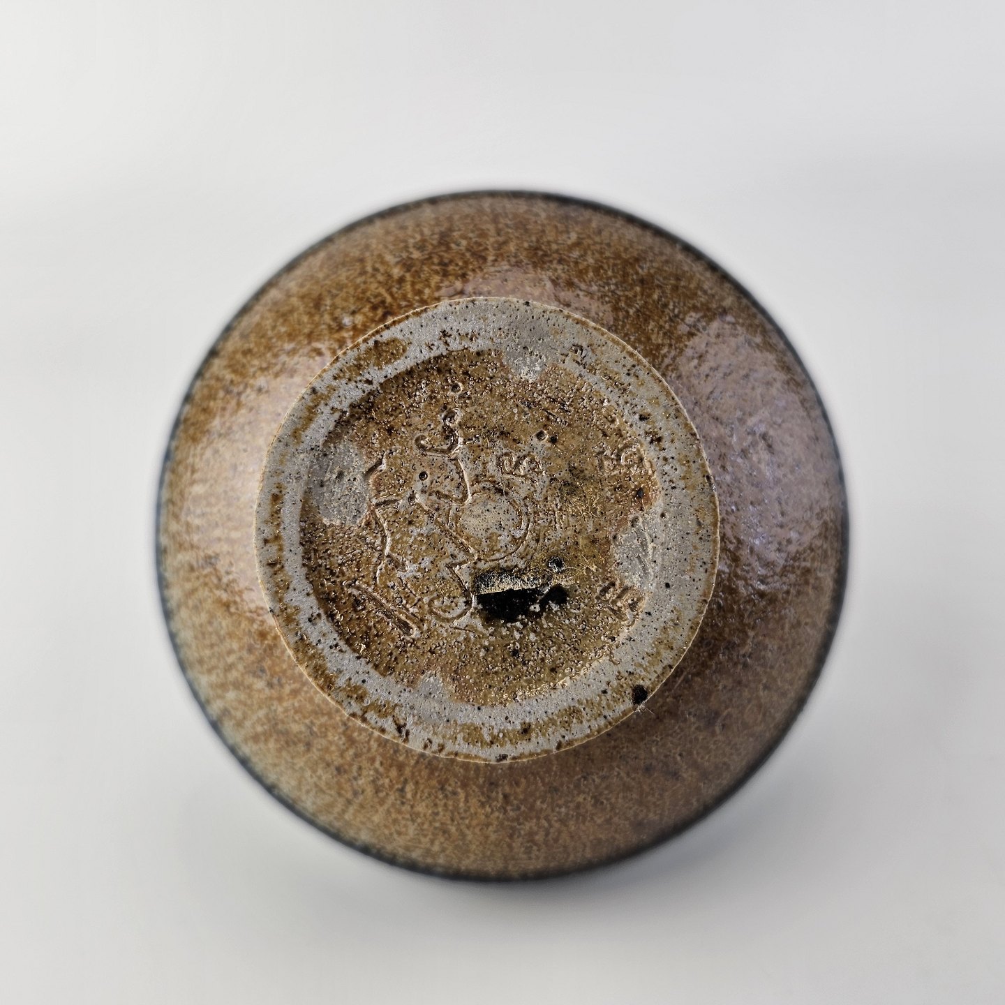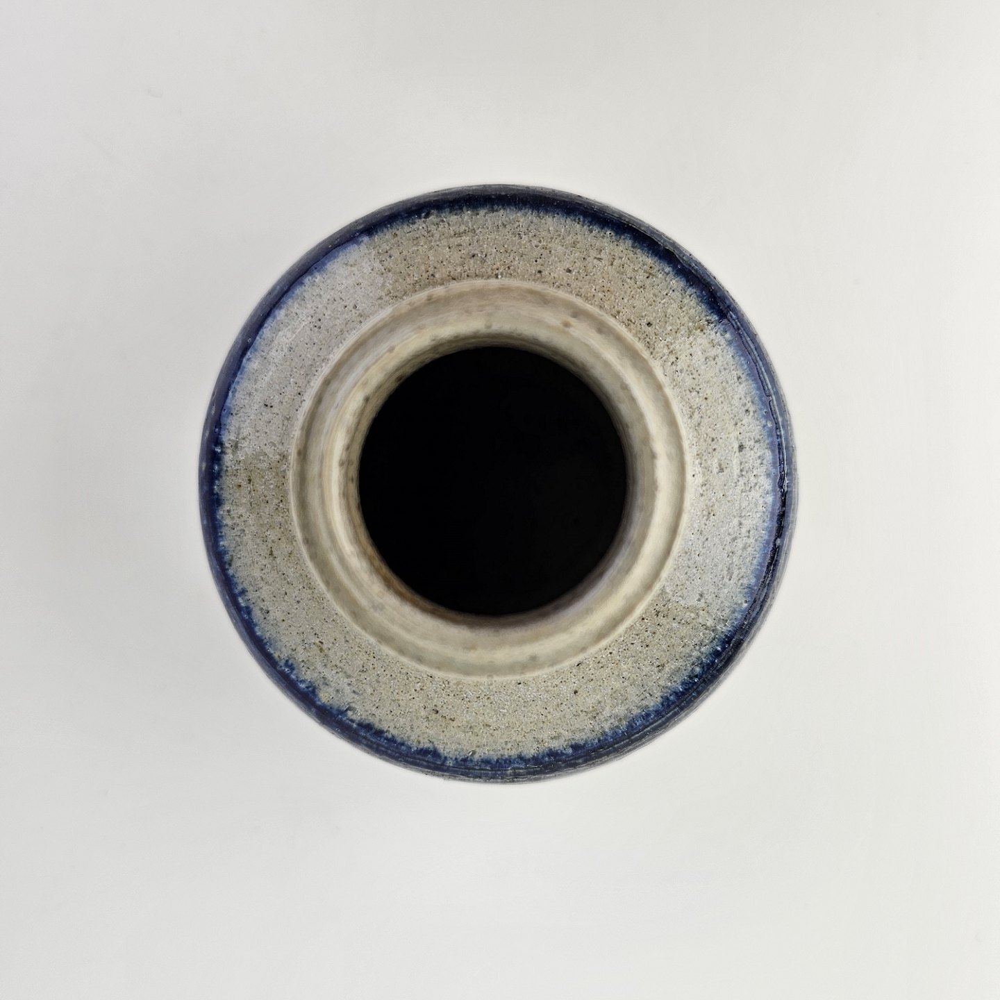 Vase smal fod og topi grå glasur, og bred midt for i blålig farve