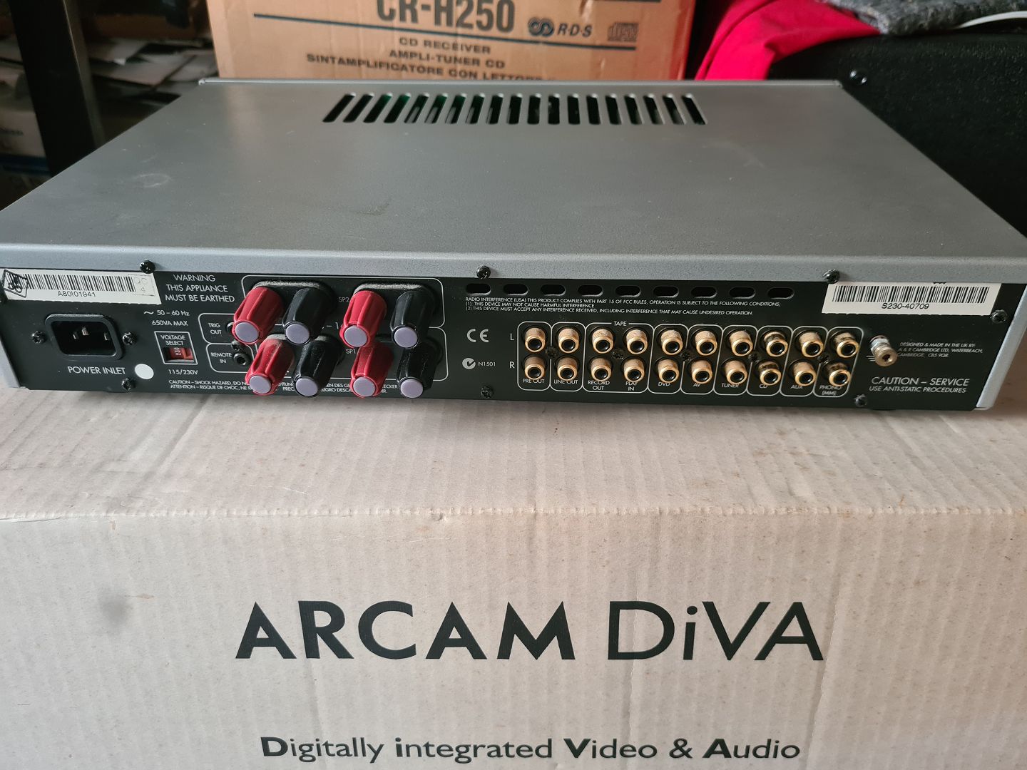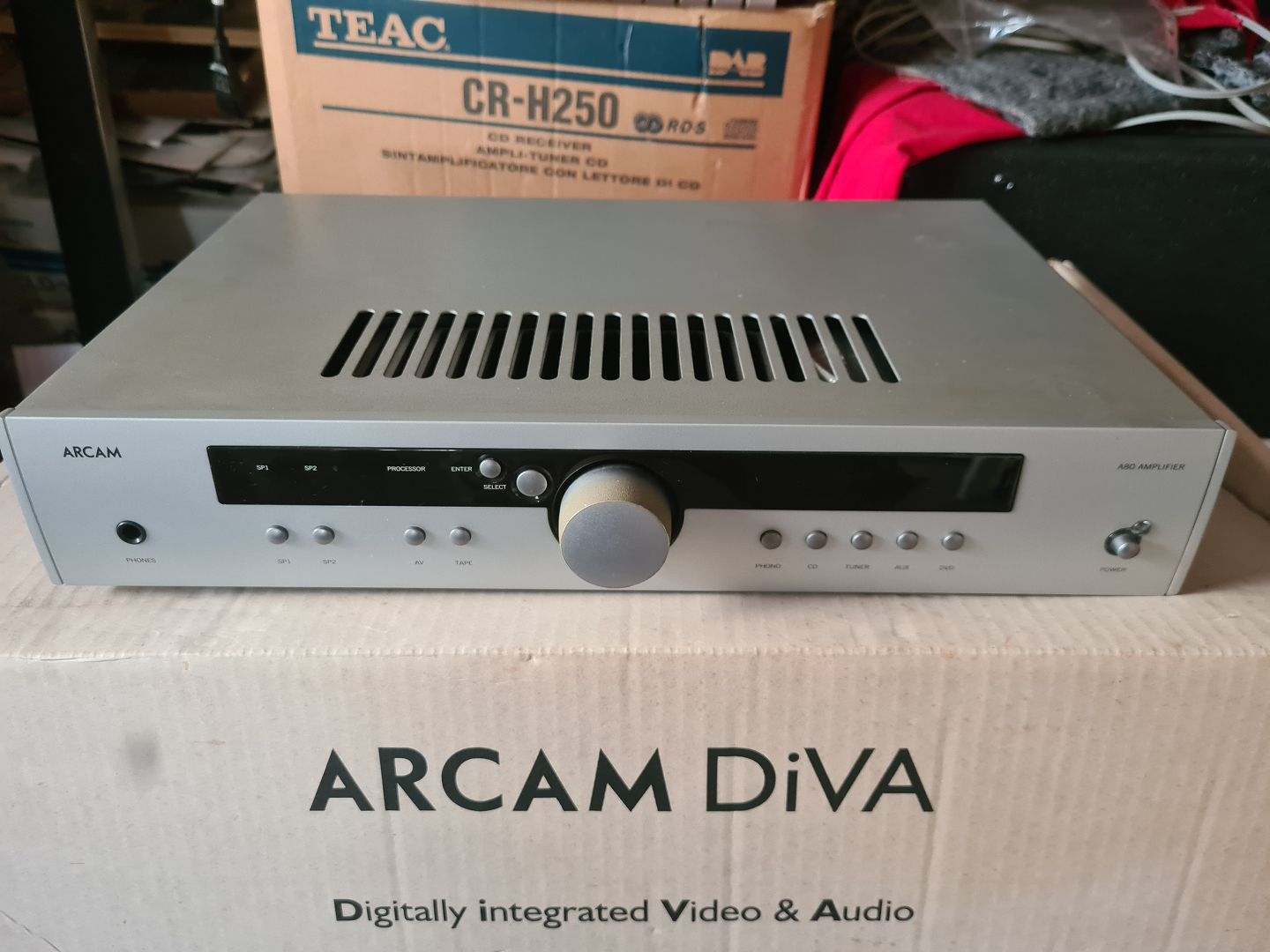 Integreret forstærker Arcam DiVA model A80. Testet og virker fint. Kommer med og i original emballage samt med strømførende kabel og fjernbetjening CR-389.