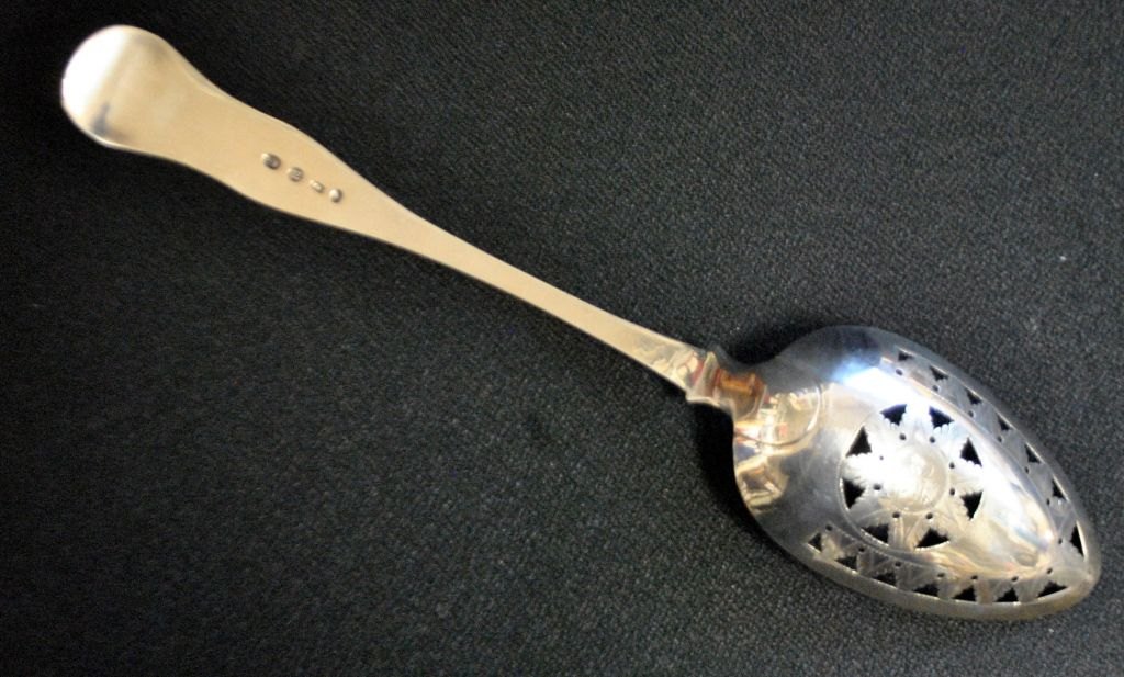 Carl Peter Foght (1802 - 1884) København, Danmark: Jordbærske i sølv. 1841. Muslinge mønstret. gennembrudt laf med dekorationer på underside. Stemplet med mestermærke, bymærke, guardein stempel og månedmærke. L.: 30 cm. Vægt: 104 gram.