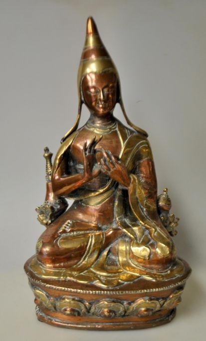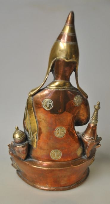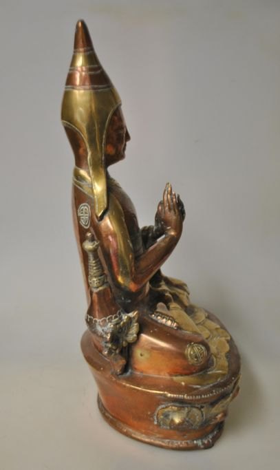 Sitting Tibetan Lama, sculpture, ca. 1950. Nepal. Probably Tsongkhapa, Made of bronze and copper. Stamped. H.: 30.5 cm.