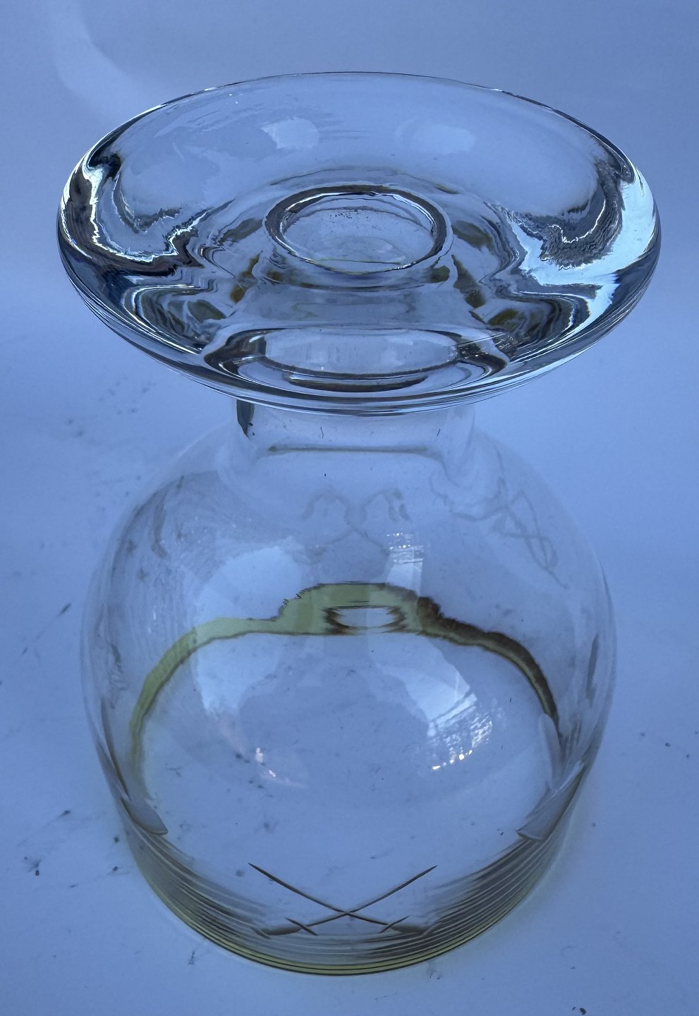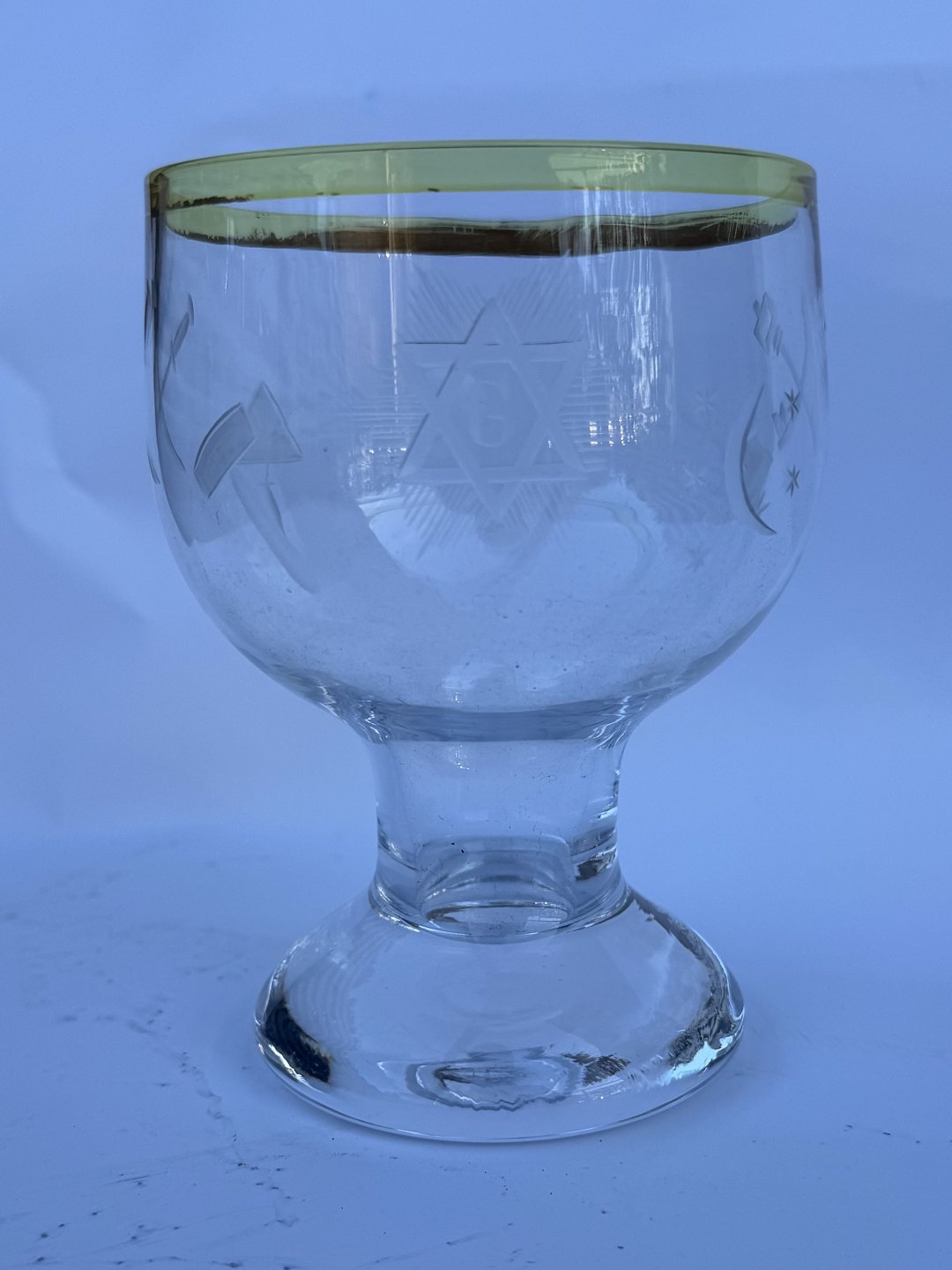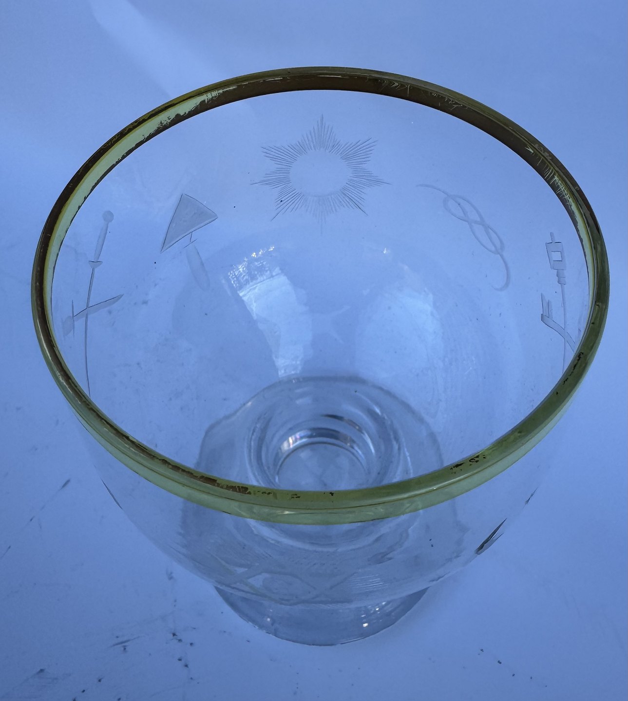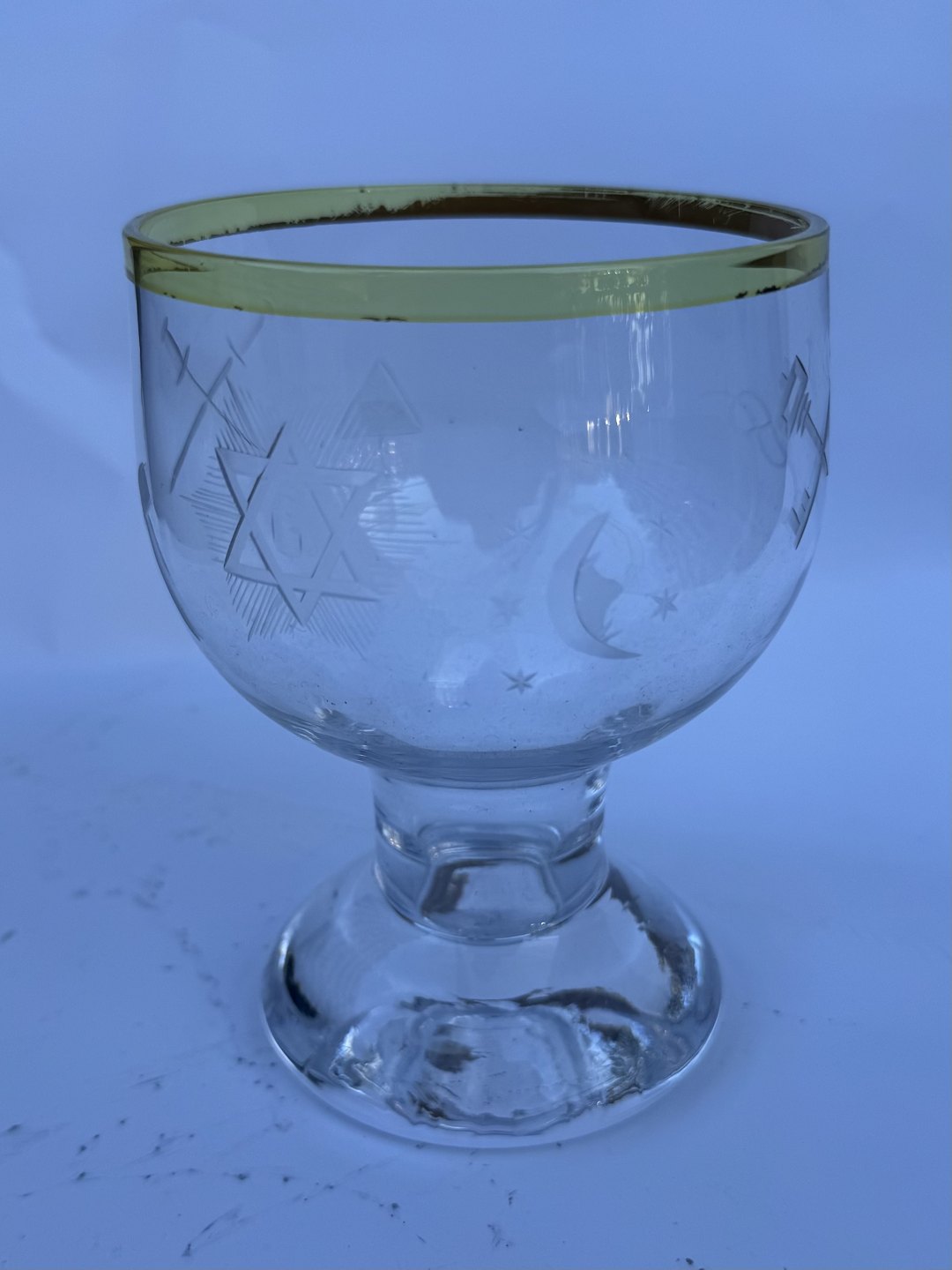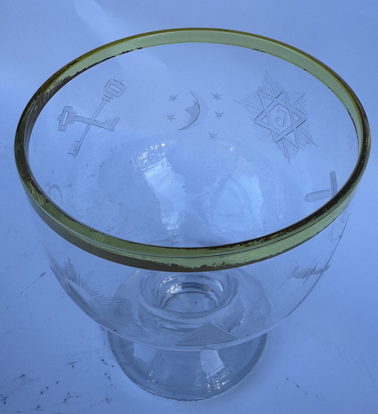 Stort glas med guldkant. Et fint glas til f.eks. øl. Stående på kraftig fod. Indgraverede frimurer symboler rundt om glasset. Fremstår i god stand. Formodes fremstillet i 1930’erne. H. 14 cm.