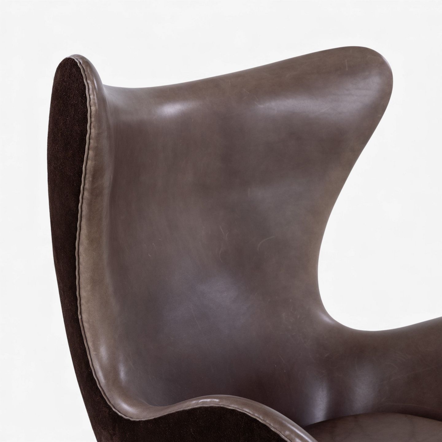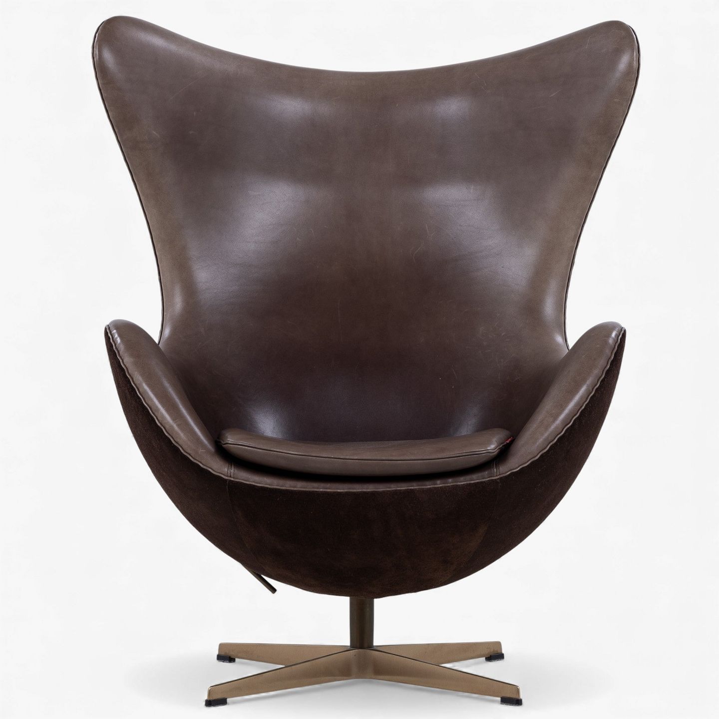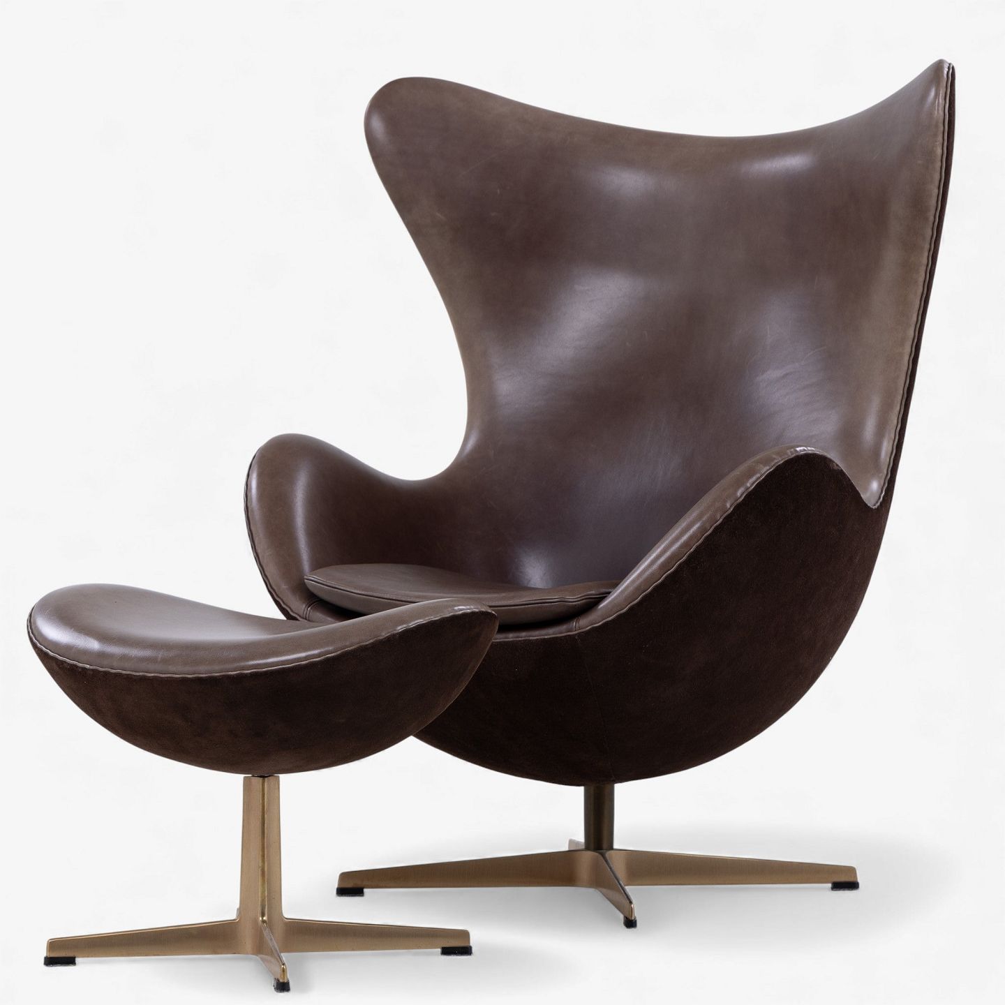AJ 3316 - 'Ægget'-lænestol m. skammel i originalt, mørkebrunt Elegance-læder og brunt ruskind på stel i bronze. Jubilæumsmodel fra 2008. Nummeret 489/999.