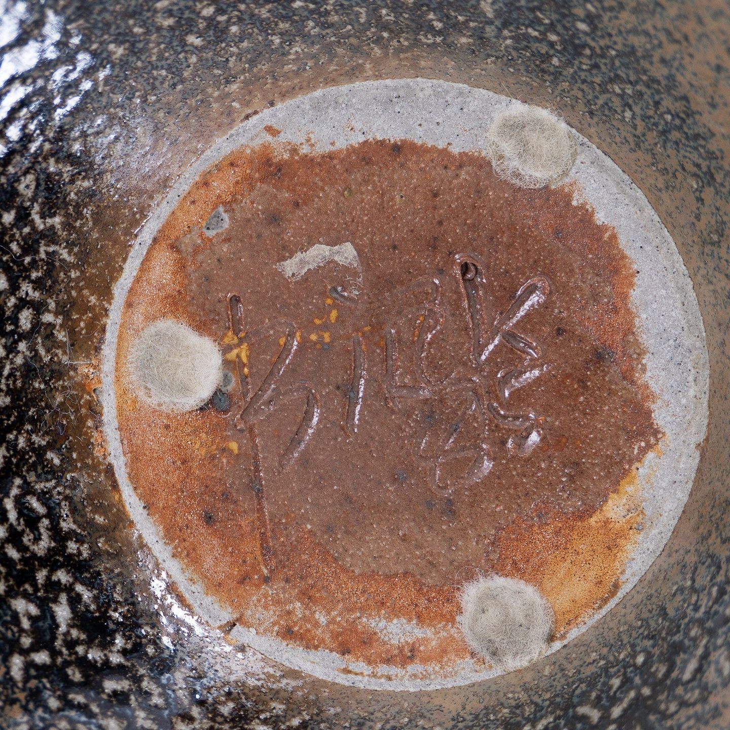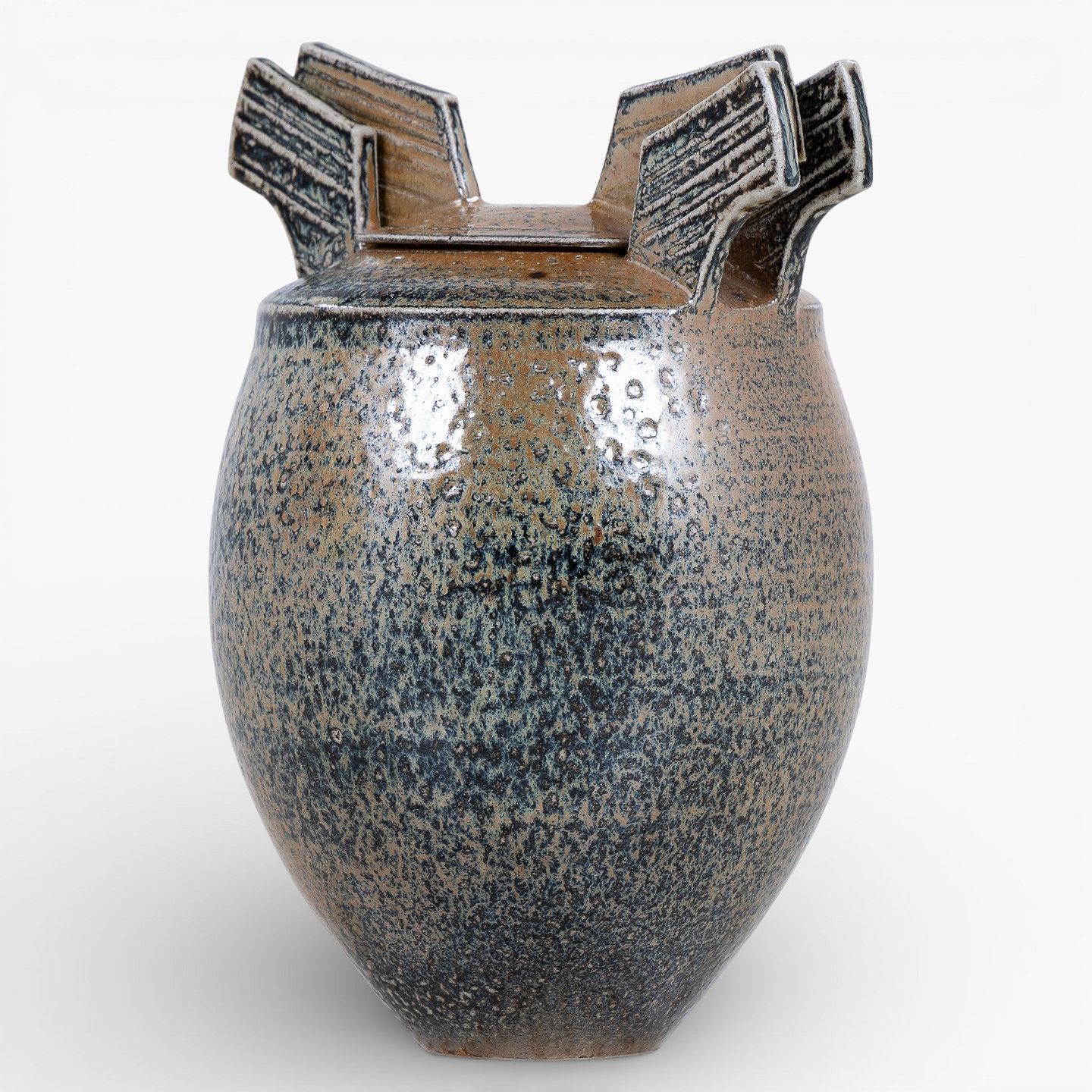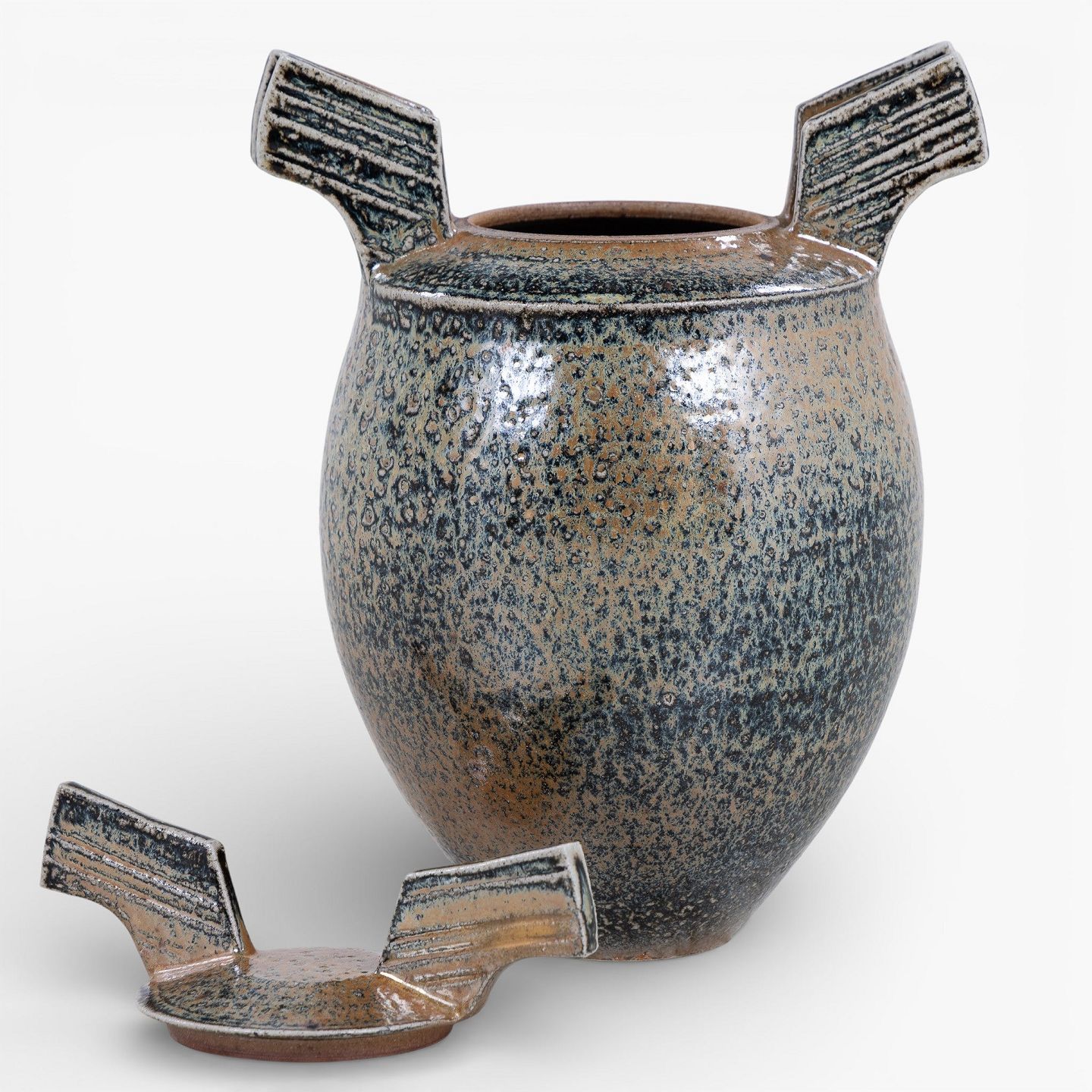 Unique lidded stoneware jar with brown salt glaze. Signed 'Birck 85'.
