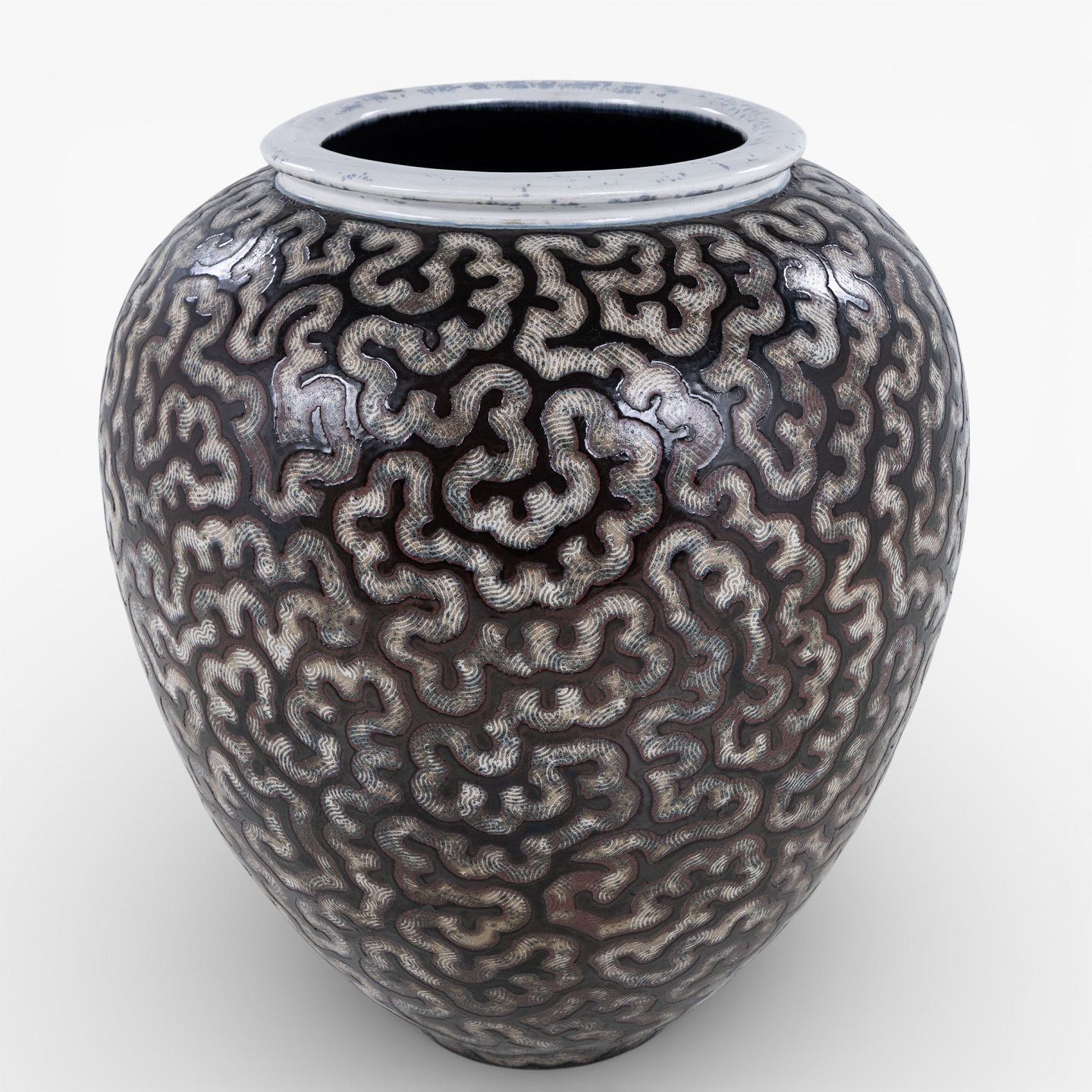Colossal stoneware jar with black glaze and white decorations. Signed.