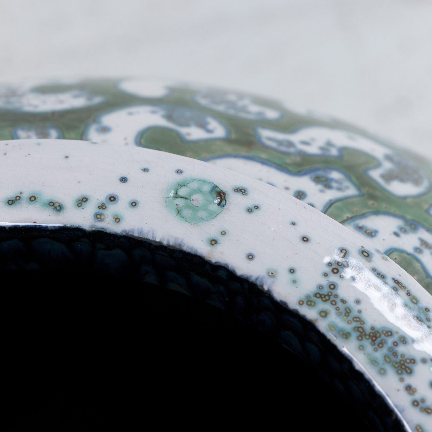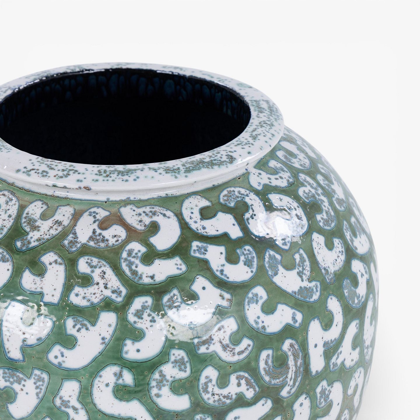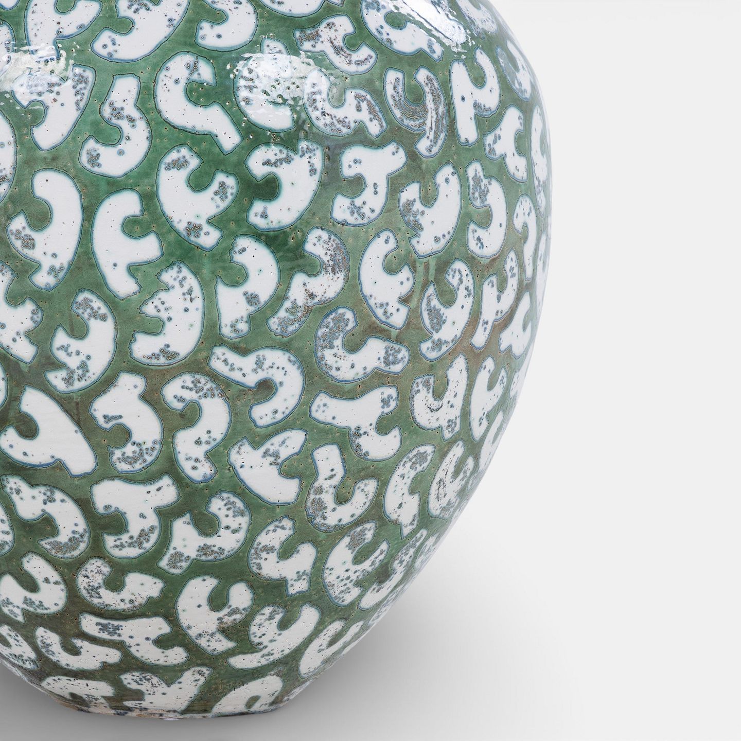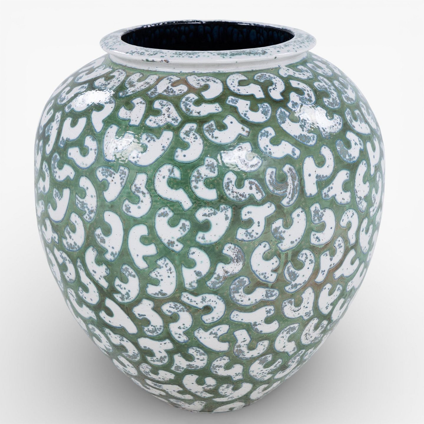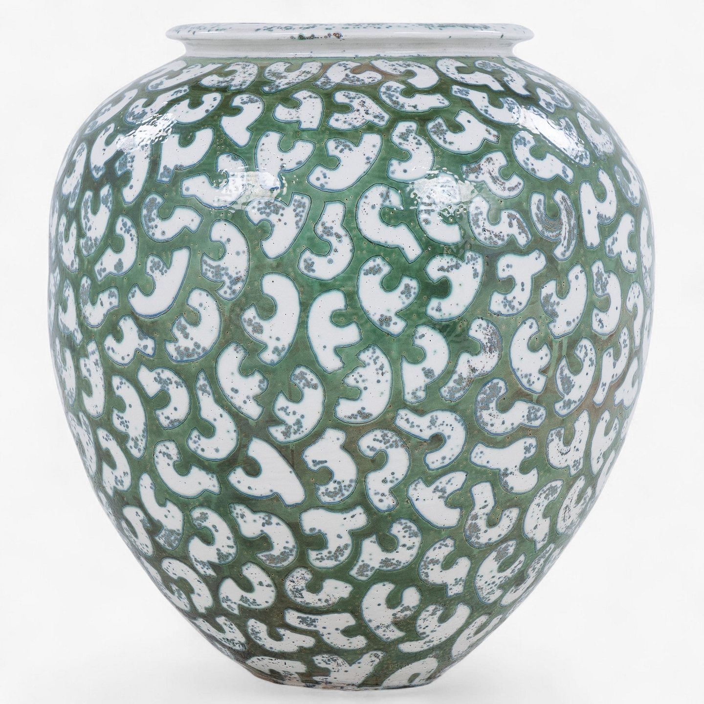 Colossal stoneware jar with green glaze and white decorations. Signed.