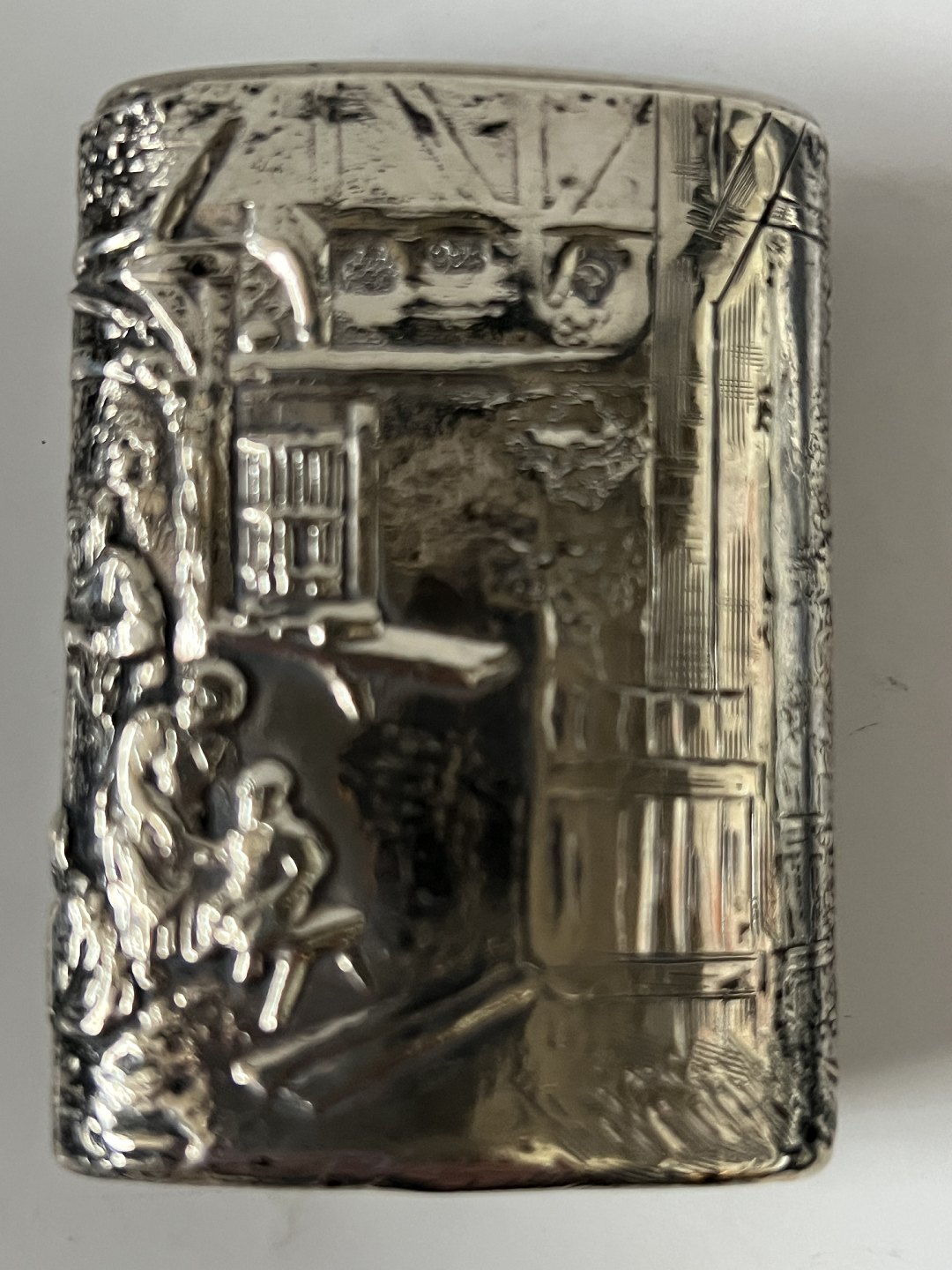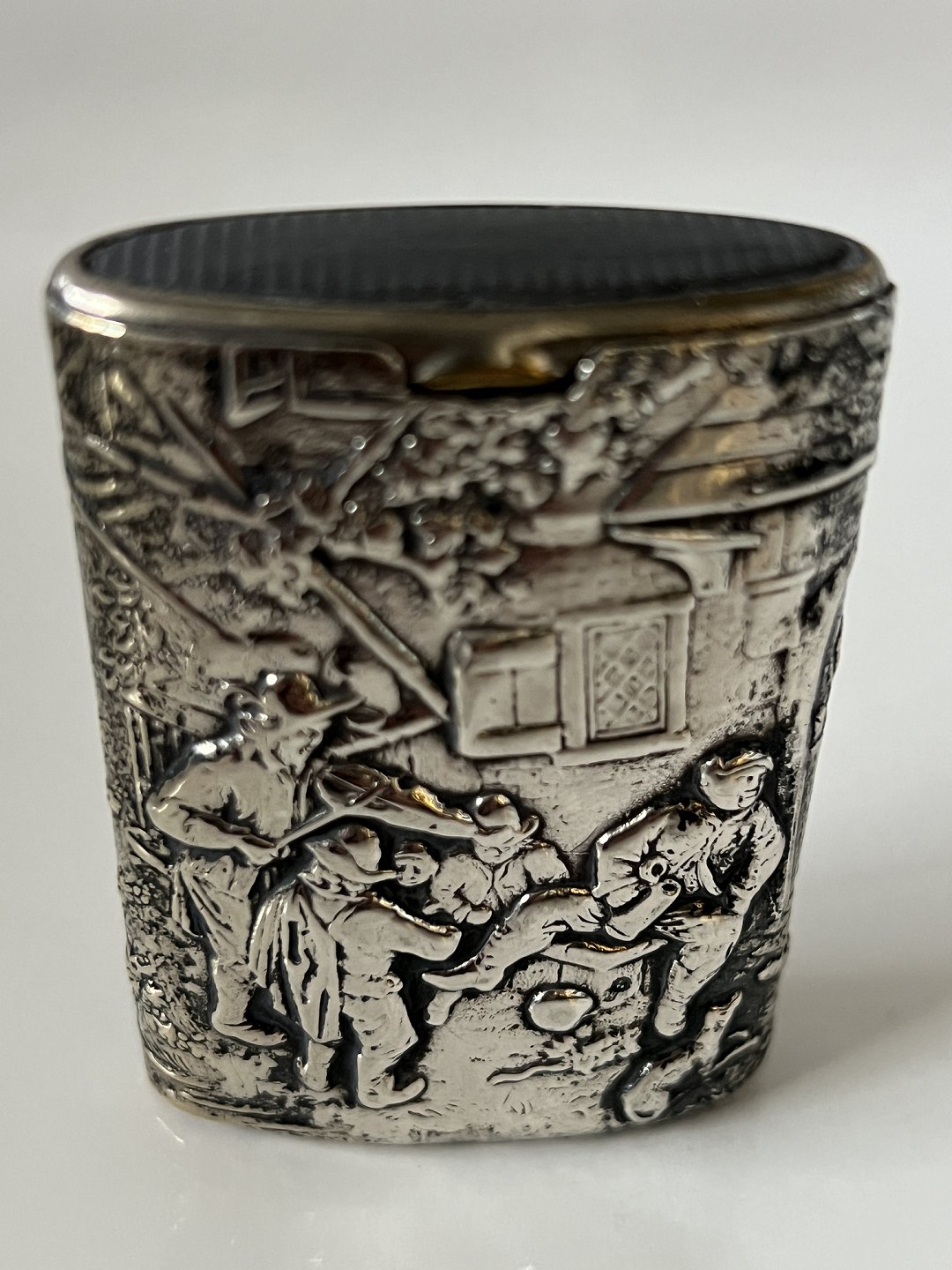 Smuk og dekorativ lille sølvæske i sterlingsølv, med flot motiv på både forside og bagside. Æsken er lavet således, at den inderste del kan skubbes ud. Derfor kan æsken bruges til mange forskellige formål. Brug den eksempelvis til tændstikker, piller, tandstikke eller noget helt andet. Sølvæskens flotte motiv giver æsken liv. Ved at pudse æsken, kan den blive helt flot og skinnende og være en praktisk og dekorativ genstand i hjemmet.