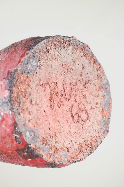 Høj og slank vase udført i stentøj med sjælden og eksperimenterende overfladeteknik, der giver en kraftig, struktureret tekstur. Glasuren fremstår i dybe rødlige nuancer med mørkere partier og tydelig vertikal bevægelse i overfladen. Den smalle hals og markante højde understreger det skulpturelle udtryk.
