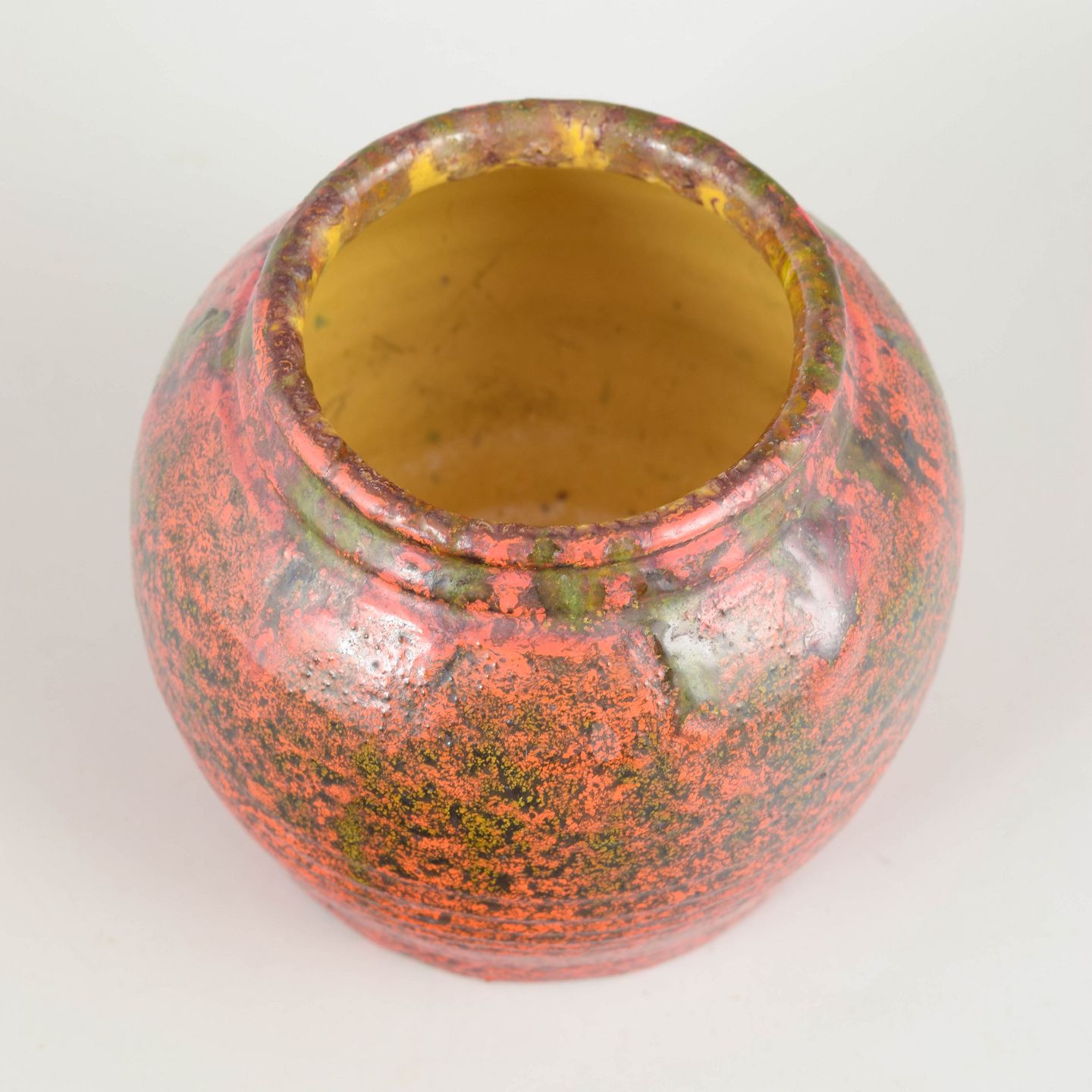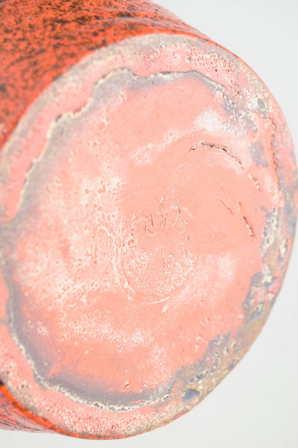 Kompakt og harmonisk vase udført i stentøj med kraftig, levende glasur i varme rød-orange nuancer med mørkere og grønlige variationer. Den afrundede form og den let indadbøjede munding giver et solidt og balanceret udtryk.