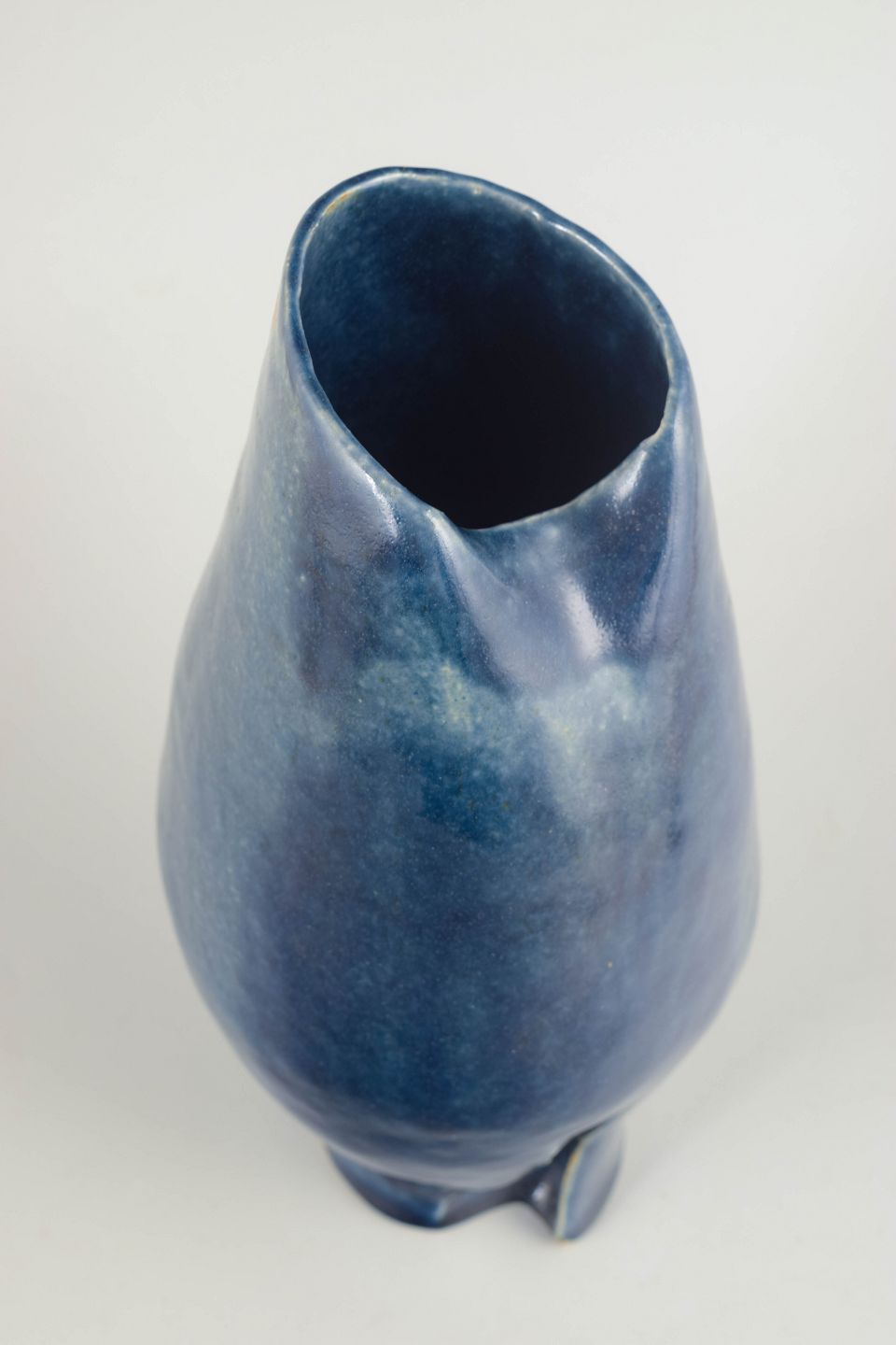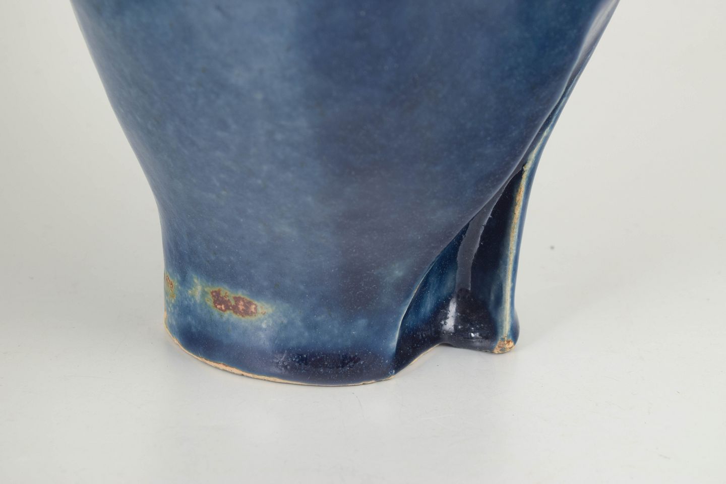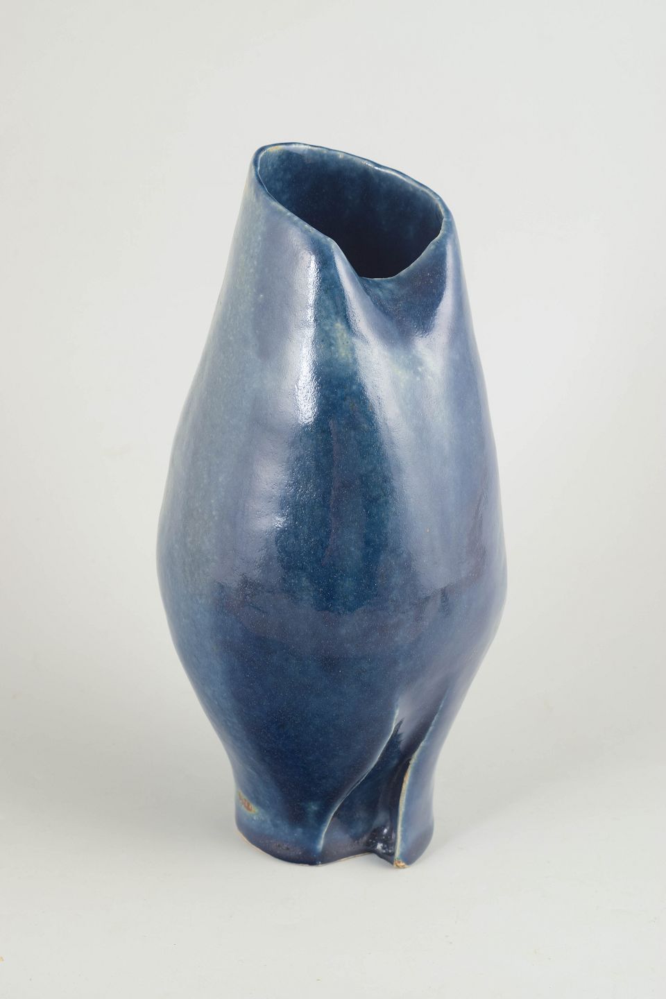 Sculptural stoneware vase with a deep blue, subtly variegated glaze and an organic, asymmetrical opening. Signed and dated 1987.