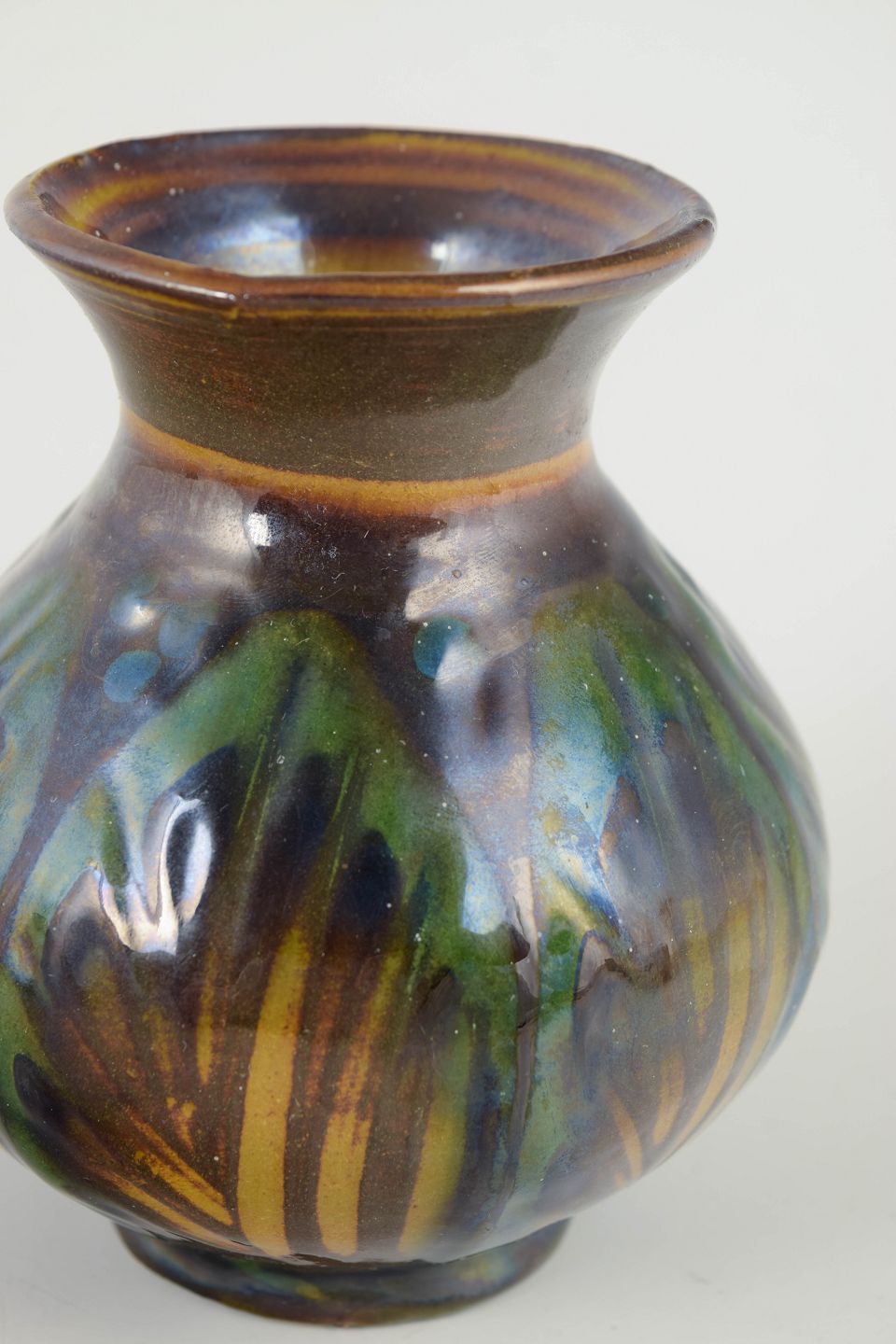 Kählers stentøjsproduktion i 1930’erne er kendt for sine eksperimenterende glasurteknikker og dekorative overflader. Oksehornsteknikken gav mulighed for at styre glasurens bevægelse direkte i materialet og resulterede i dynamiske, næsten flammende mønstre. Mindre vaser som denne forener teknisk kunnen med et stærkt visuelt udtryk og er karakteristiske for periodens keramiske formsprog.