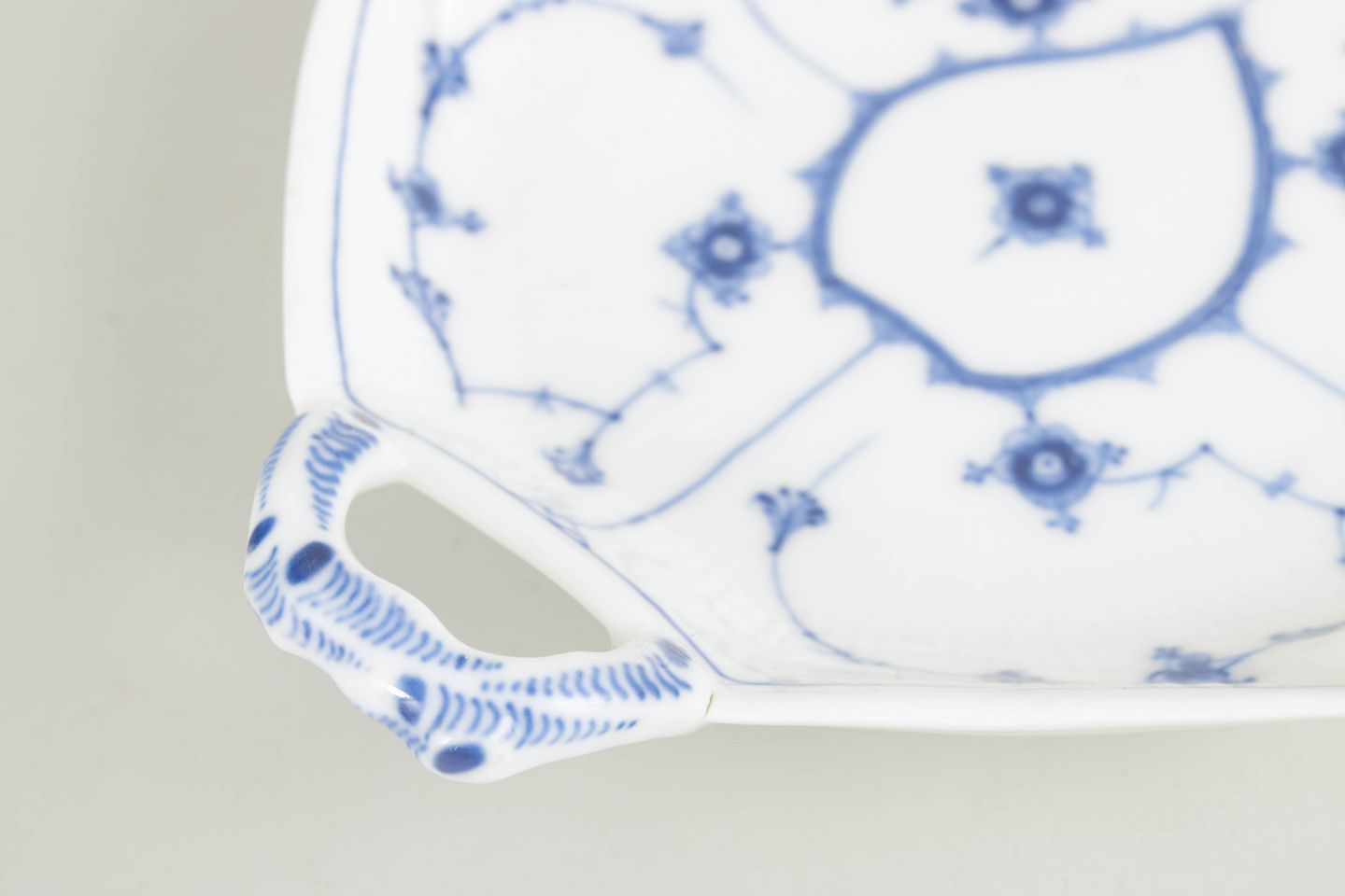 Musselmalet riflet er Royal Copenhagens ældste stel, introduceret i 1775, og har siden været et grundelement i dansk porcelænshistorie. I 1800-tallet blev stellet produceret i et bredt udvalg af specialformer, herunder bladformede fade, der afspejler periodens sans for naturinspirerede former og raffineret bordkultur. Disse tidlige dele er i dag særligt eftertragtede blandt samlere.