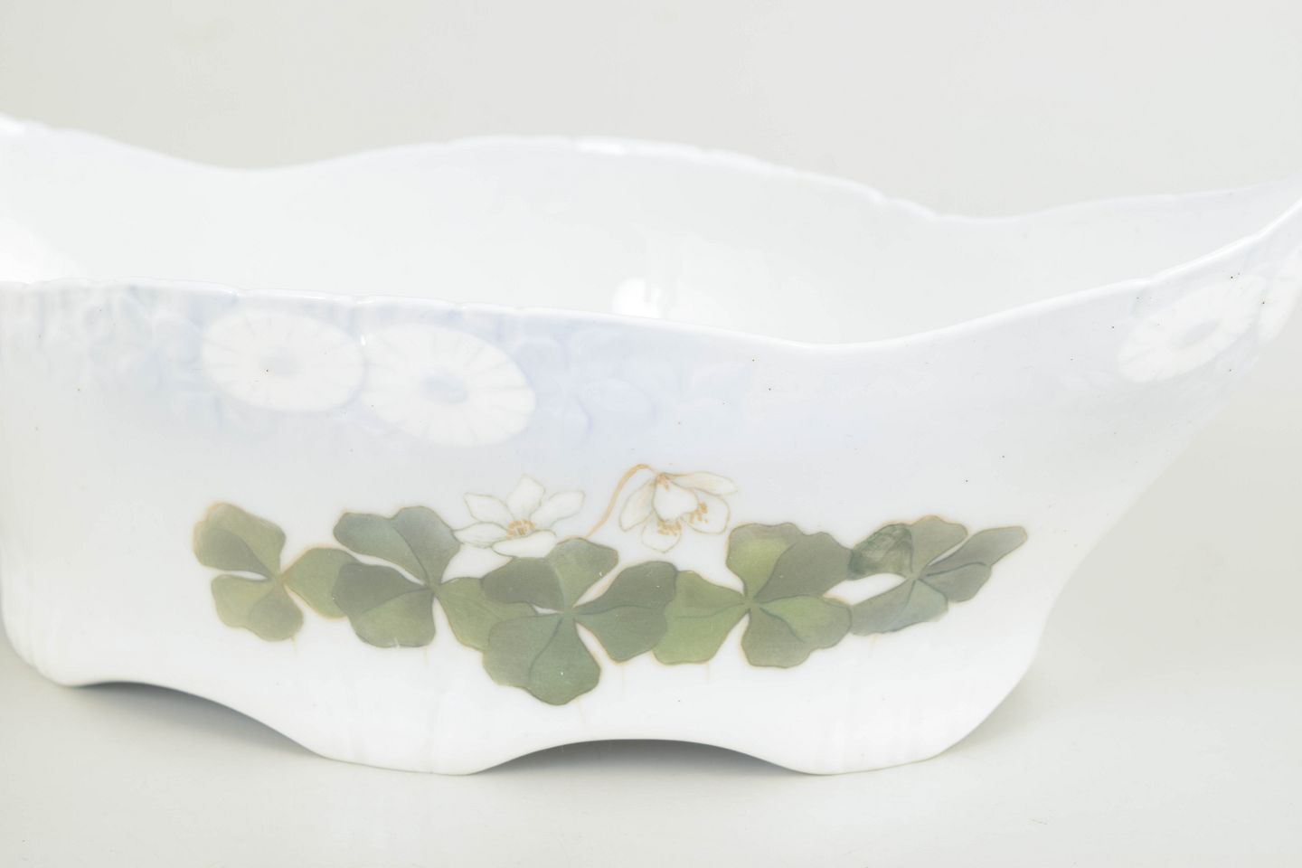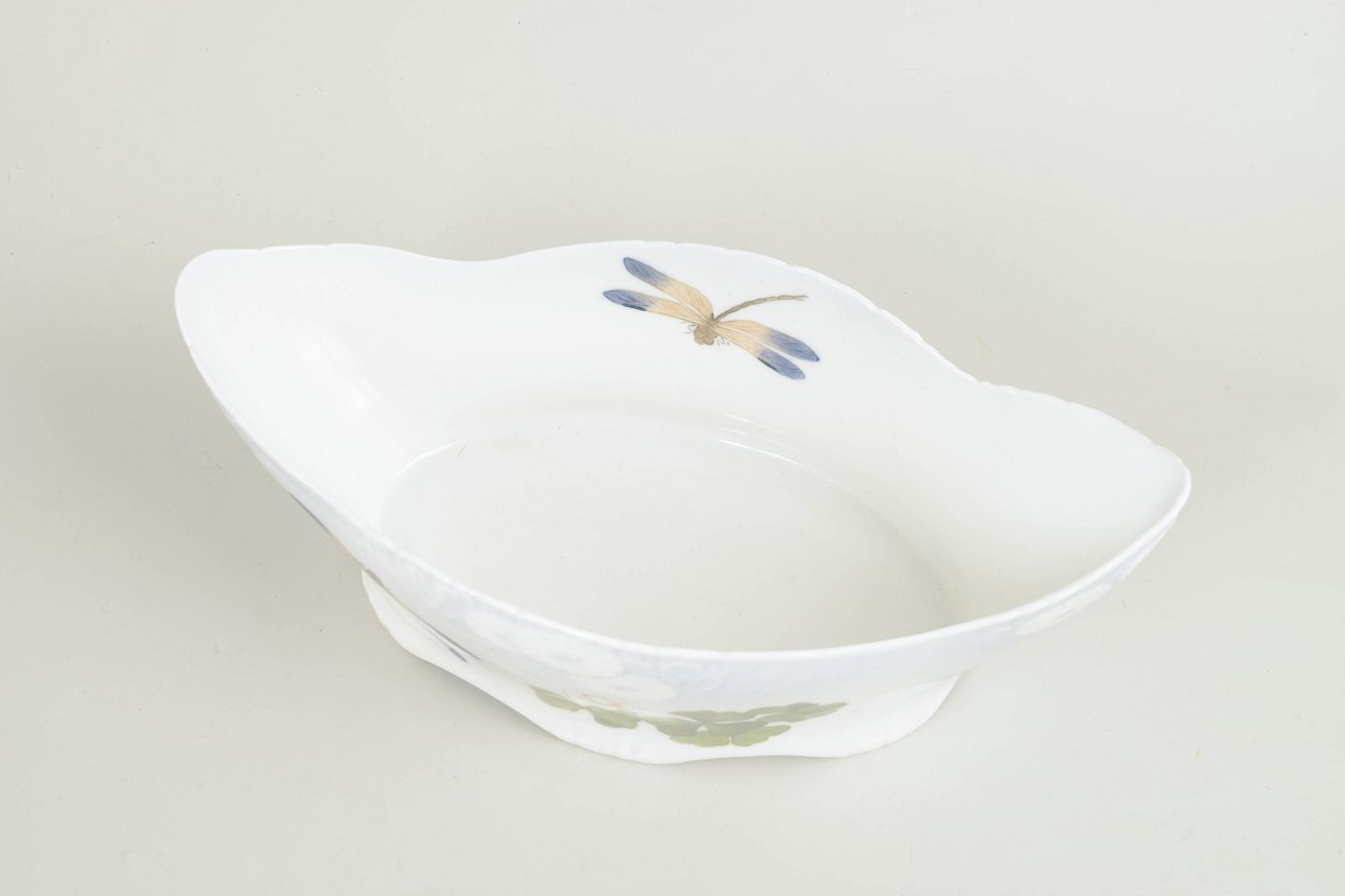 Blødt formet jardiniere i porcelæn udført i Art Nouveau-stil med organisk, bølgende kontur og håndmalet dekoration med sommerfugle og bladmotive. Et dekorativt plantekar fra begyndelsen af 1900-tallet, karakteristisk for periodens naturinspirerede formsprog.