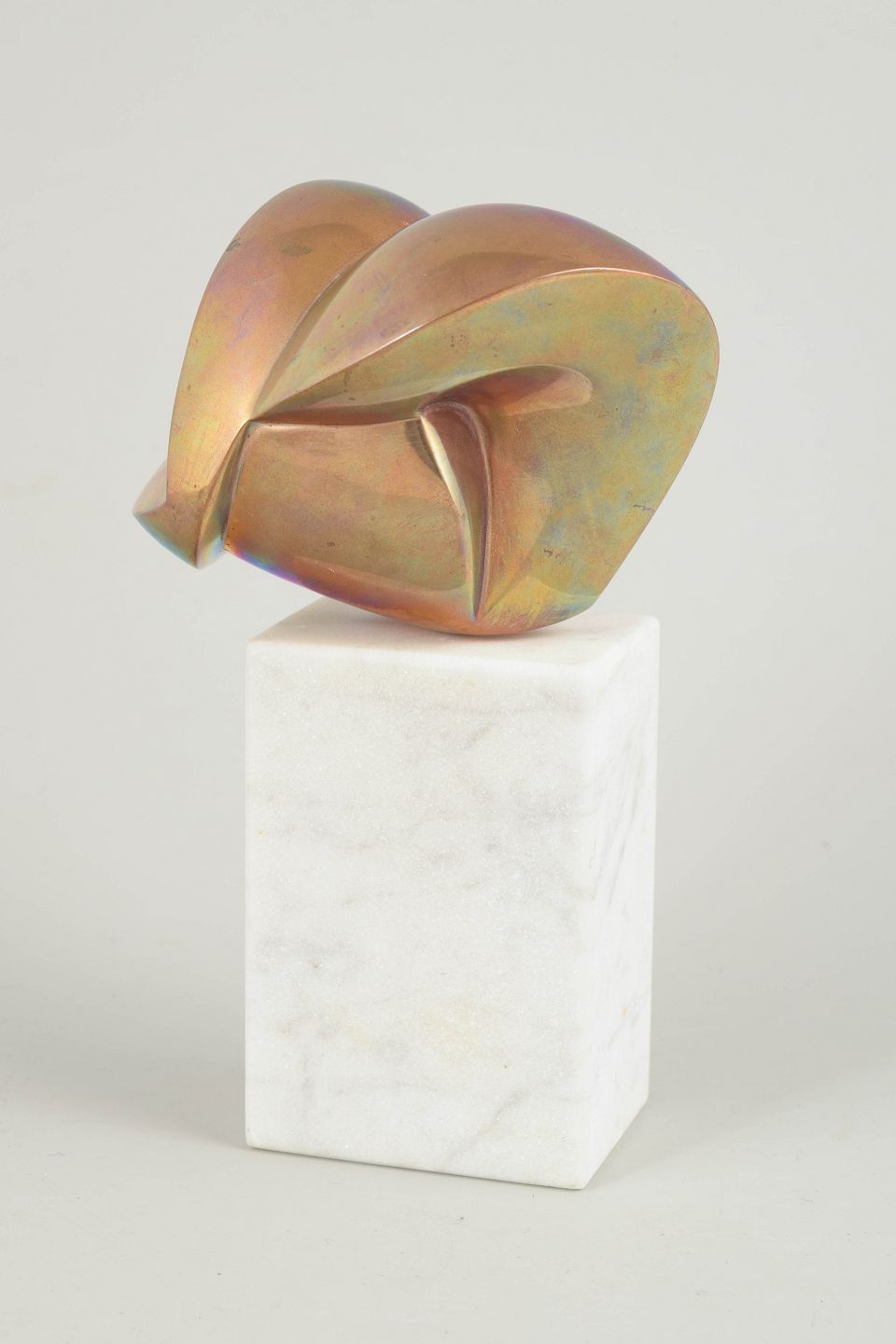 Abstrakt, organisk formet skulptur i massiv bronze med varm, nuanceret patina, monteret på rektangulær marmorsokkel. Skulpturen er signeret og nummereret 2/9.