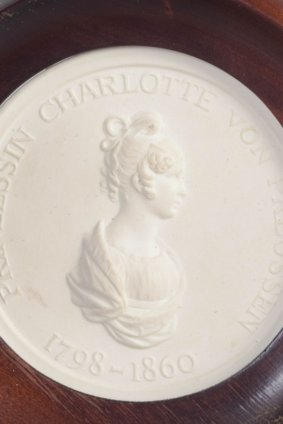 Rund reliefplakette i hvid biscuit porcelæn med klassisk profilportræt af prinsesse Charlotte af Preussen, omgivet af cirkulær inskription, monteret i bred, rund træramme. Udført i medalje lignende, neoklassisk stil, hvor den matte biscuit overflade fremhæver portrættets fine modellering.
