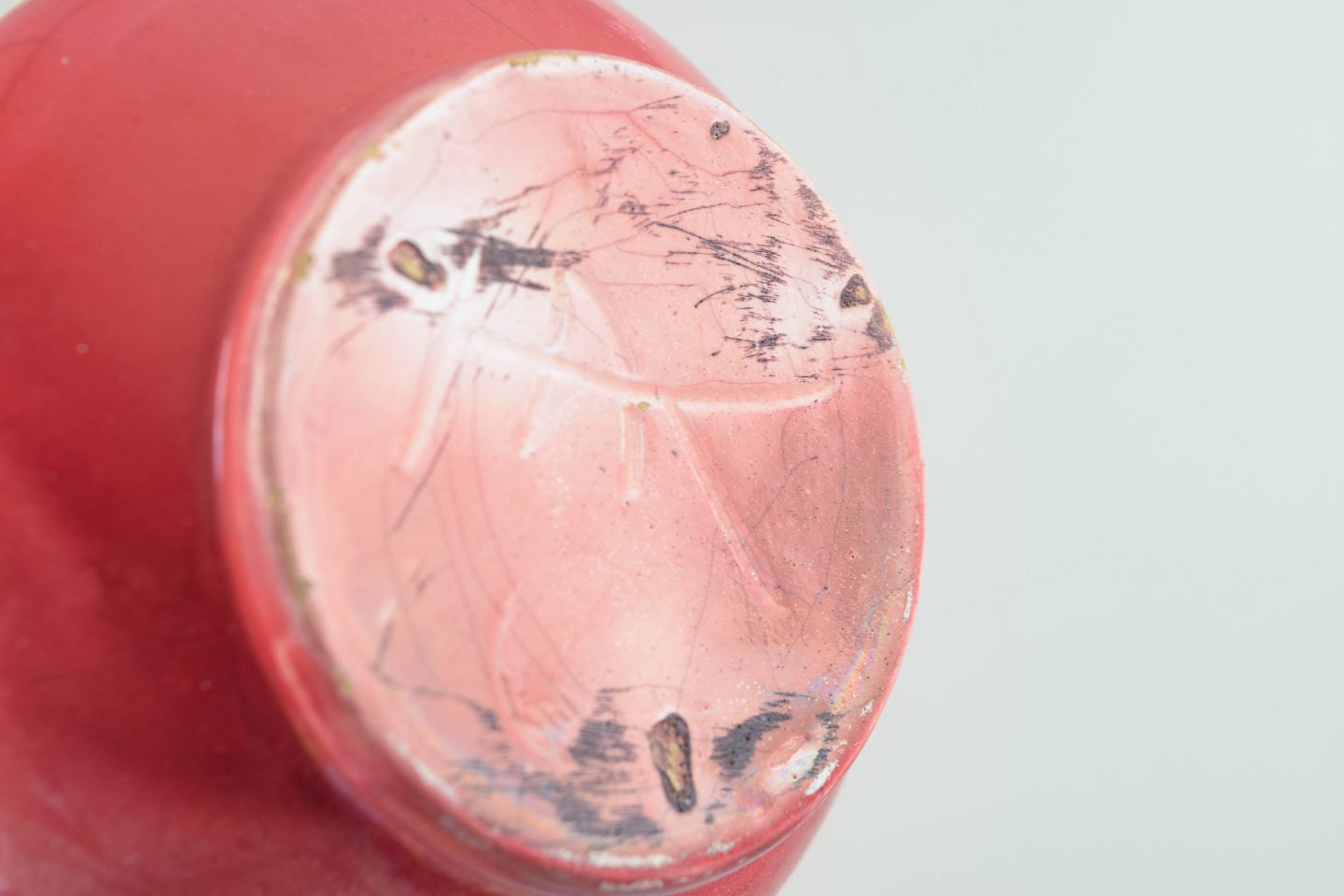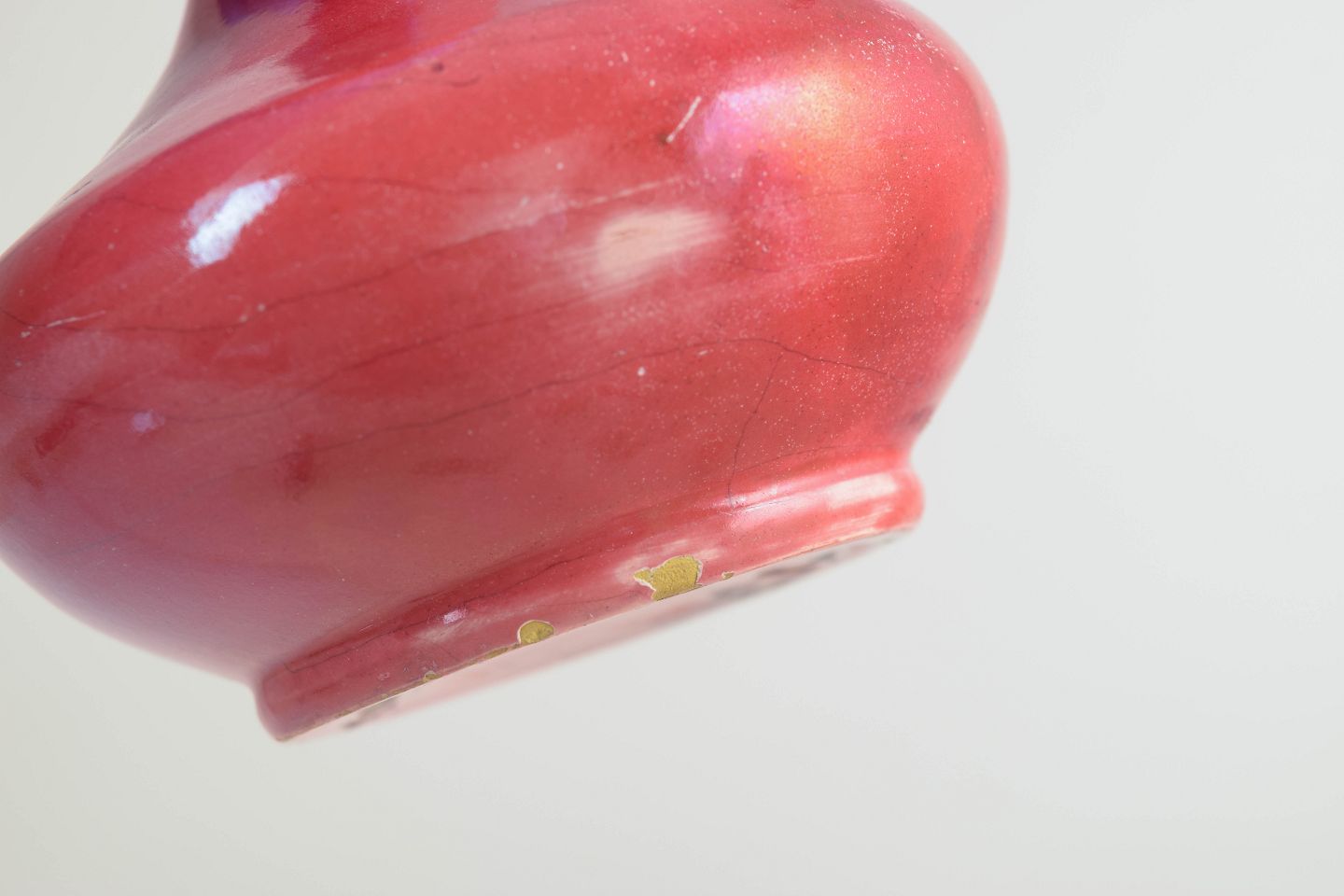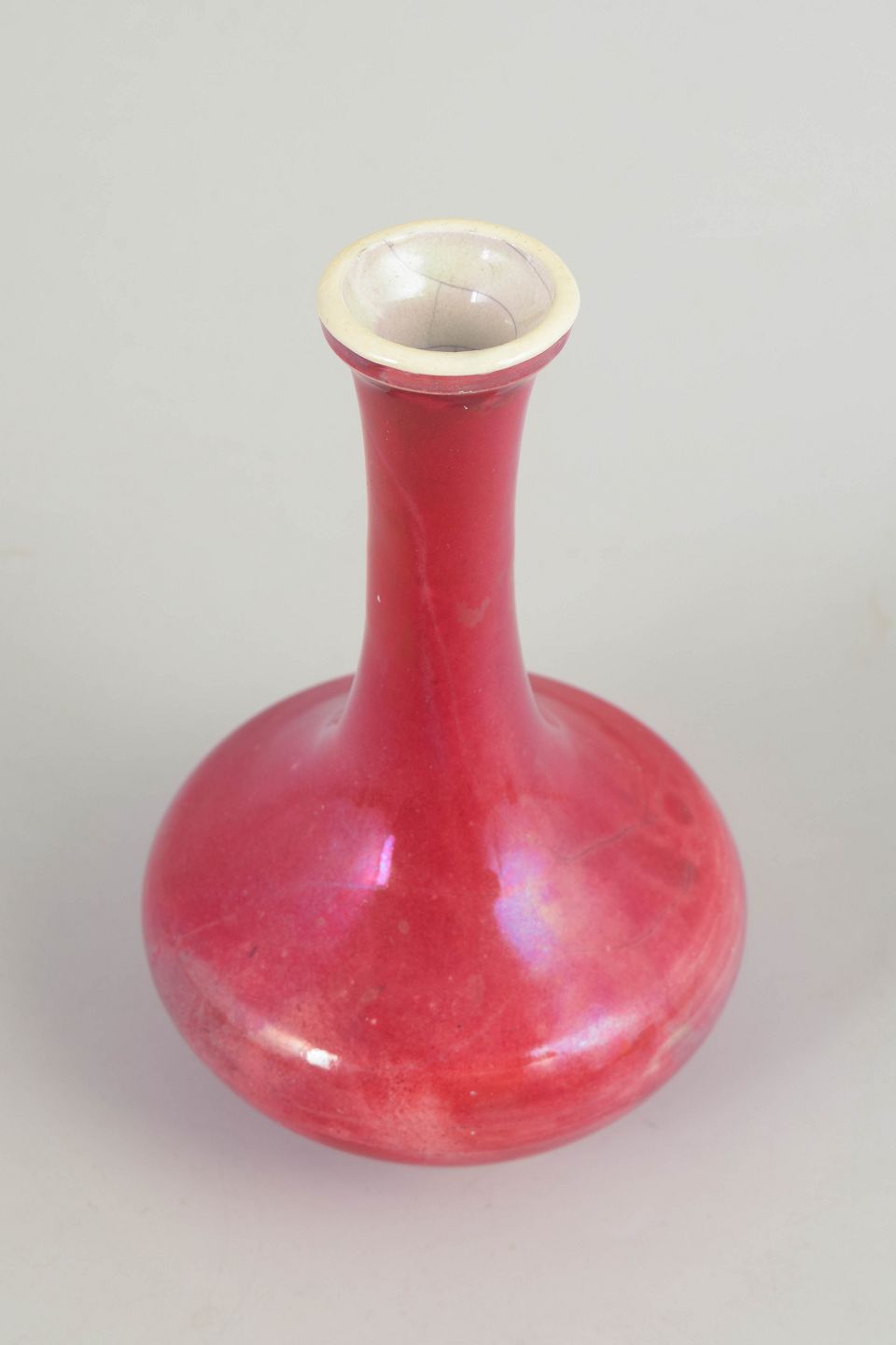 Slankhalse vase med rundbulet korpus og sjælden dybrød glasur med let levende farvespil. Udført i glaseret stentøj og formgivet i et tidligt 1900-tals formsprog.