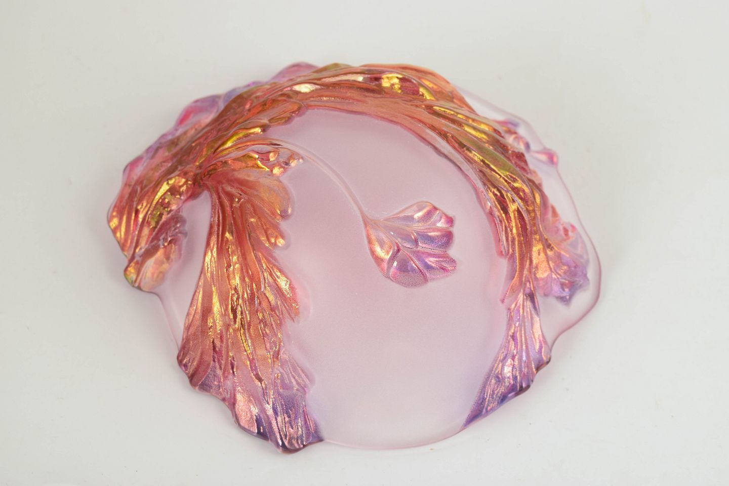 Mundblæst kunstglasskål med organisk, bølgende form og let opadbøjet kant. Dekoreret med pålagte, blad- eller kronbladslignende elementer i rosa, lilla og ravtoner, som giver et levende og skulpturelt udtryk.