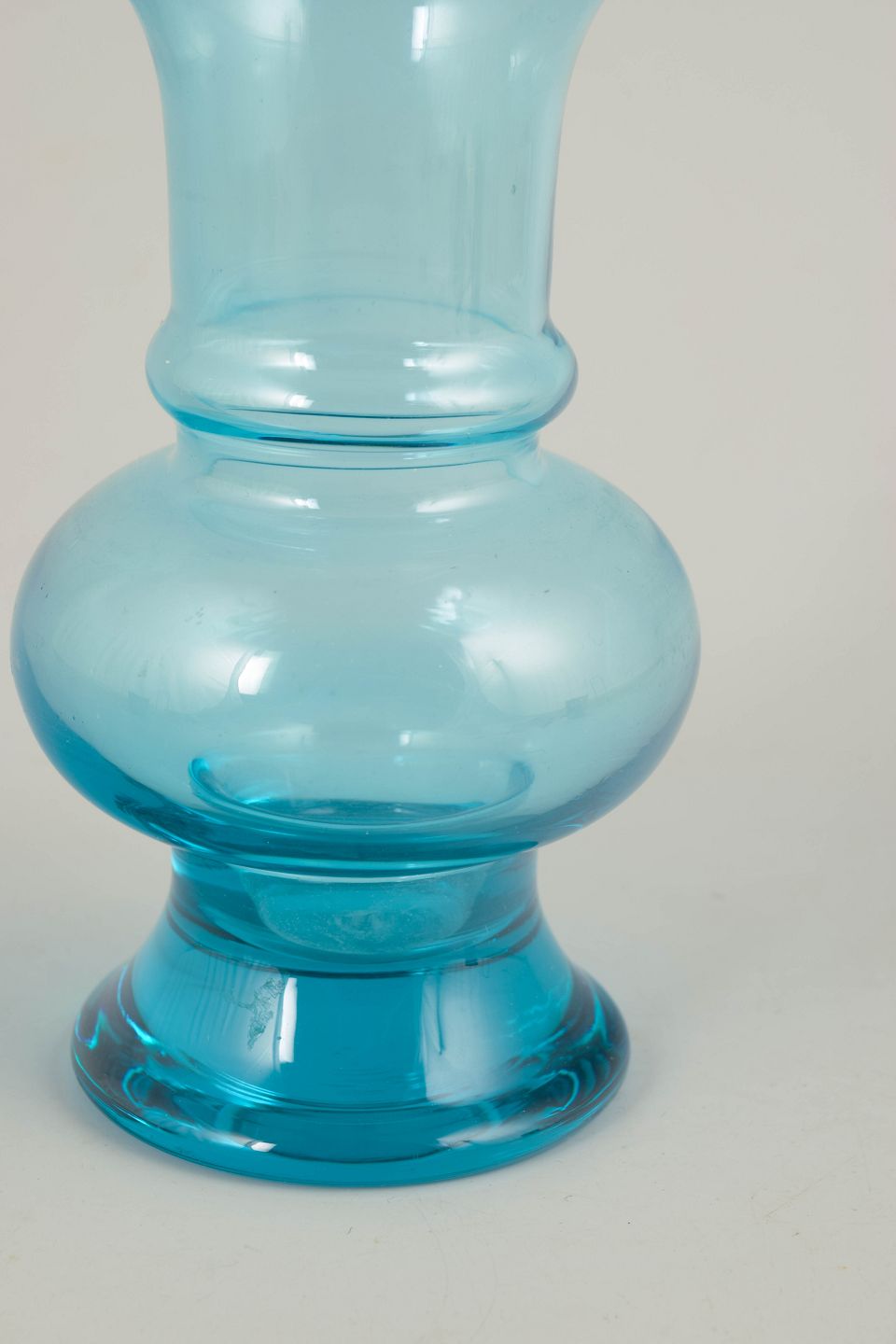 Elegant vase i klart turkisblåt glas med balanceret, skulpturel profil og blød, rundet krop. Mundblæst udførelse med let udadbøjet hals og fod, typisk for finsk kunstglas fra 1970’erne.
