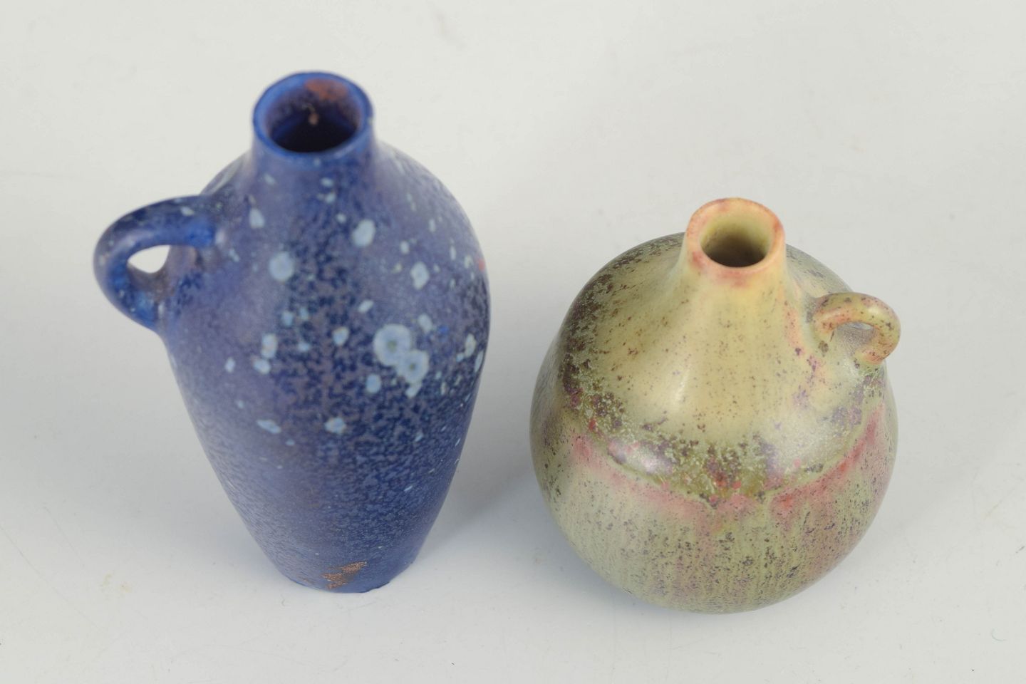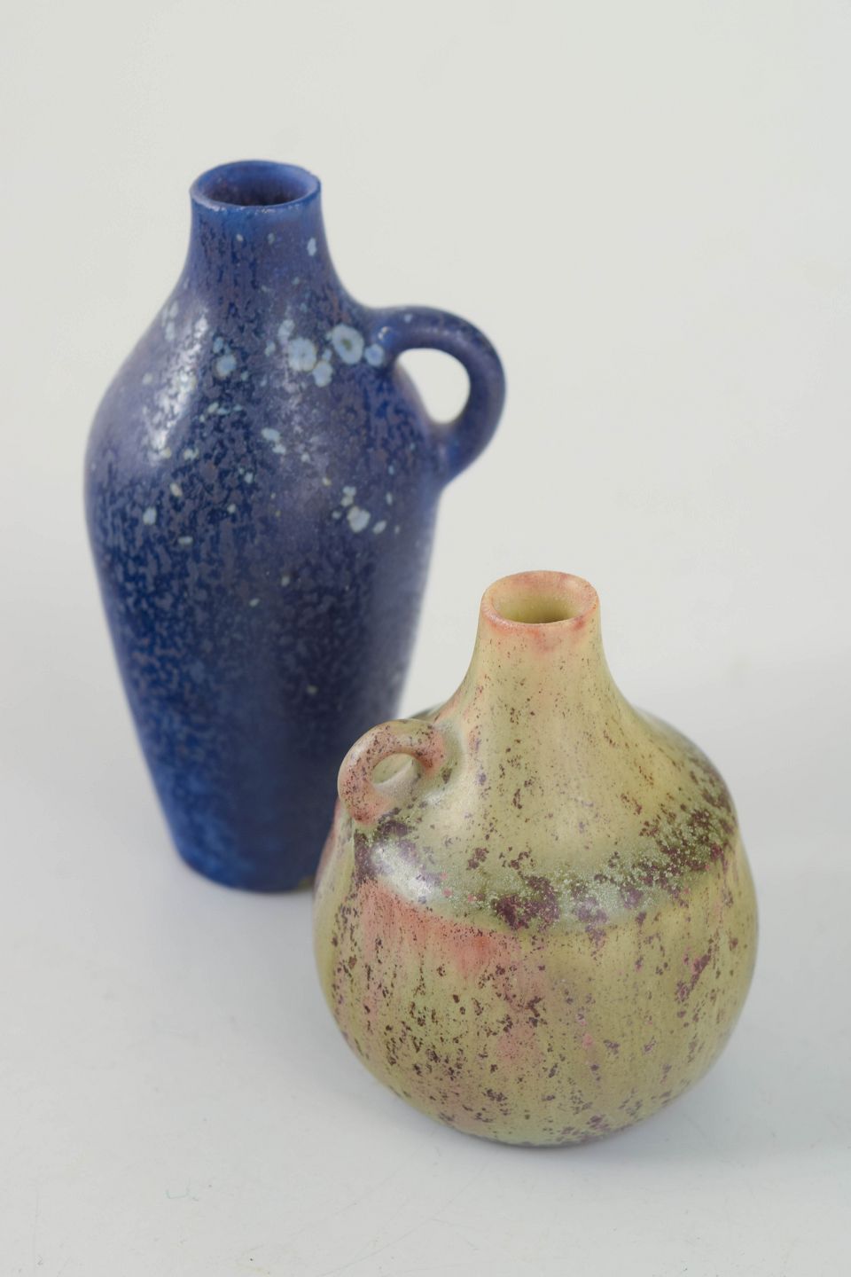 Set comprising two miniature thrown stoneware pitchers with characteristic glazes. Organic forms with small handles.